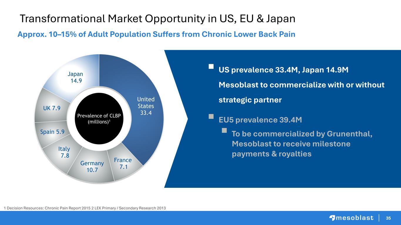 34 Rexlemestrocel-L for CLBP: Huge Commercial Opportunity ~35M patients in US suffer from CLBP of which ~60% is due to degenerative disc disease (DDD) ~7M US patients have moderate / severe DDD within 5 years of diagnosis that is refractory to medical therapies including opioids P3 trial results to confirm first trial pain reduction at 12 months expected mid- CY2027 Potential approval following Priority Review Q2 CY2028 10% of prevalent market penetration represents US$14B per year in product sales Filing BLA with FDA in Q3 CY2027 Substantial Unmet Need Timelines to CLBP Commercial Launch