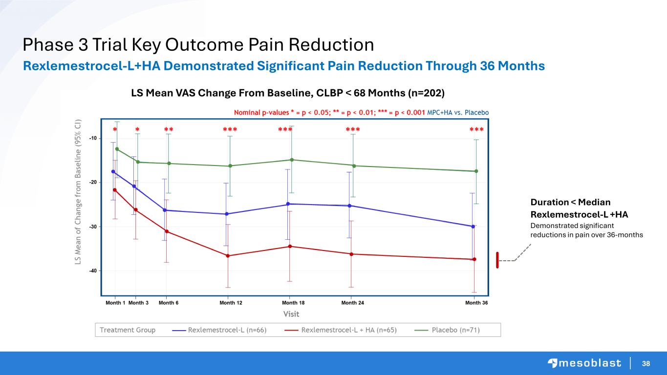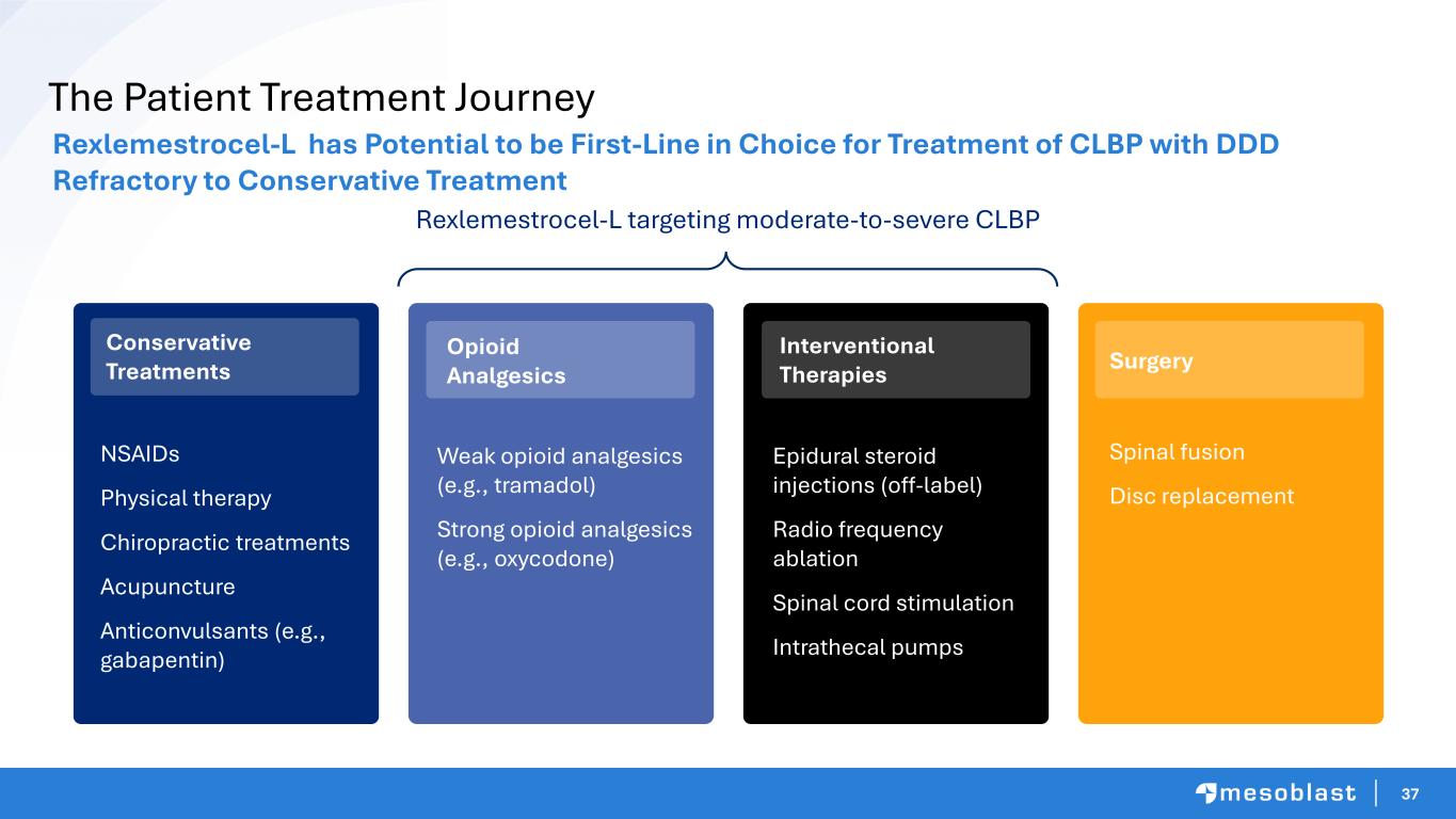 37 The Patient Treatment Journey Rexlemestrocel-L has Potential to be First-Line in Choice for Treatment of CLBP with DDD Refractory to Conservative Treatment Rexlemestrocel-L targeting moderate-to-severe CLBP NSAIDs Physical therapy Chiropractic treatments Acupuncture Anticonvulsants (e.g., gabapentin) Epidural steroid injections (off-label) Radio frequency ablation Spinal cord stimulation Intrathecal pumps Conservative Treatments Opioid Analgesics Weak opioid analgesics (e.g., tramadol) Strong opioid analgesics (e.g., oxycodone) Interventional Therapies Surgery Spinal fusion Disc replacement