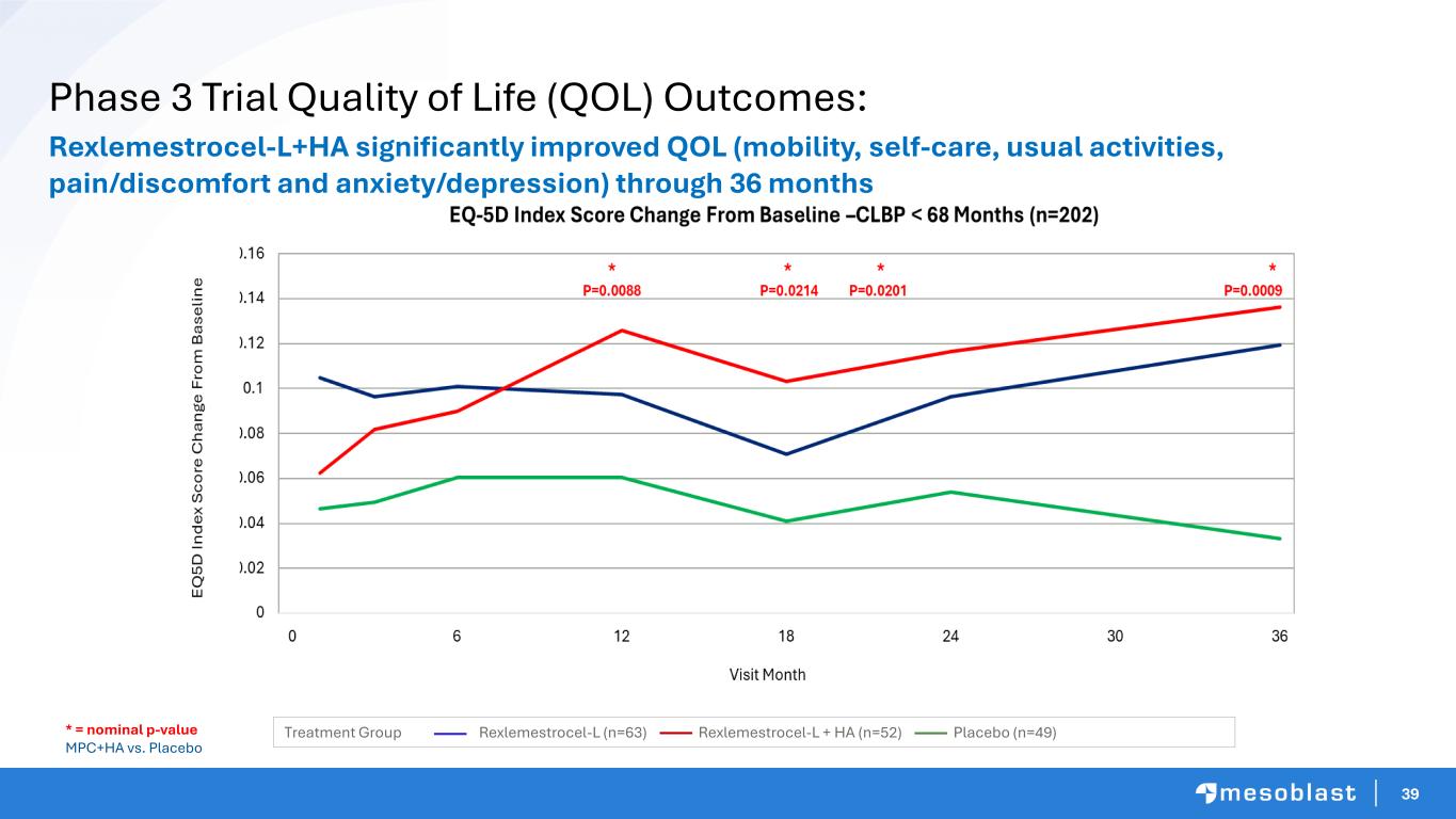 38 Phase 3 Trial Key Outcome Pain Reduction Duration < Median Rexlemestrocel-L +HA Demonstrated significant reductions in pain over 36-months LS Mean VAS Change From Baseline, CLBP < 68 Months (n=202) Rexlemestrocel-L+HA Demonstrated Significant Pain Reduction Through 36 Months