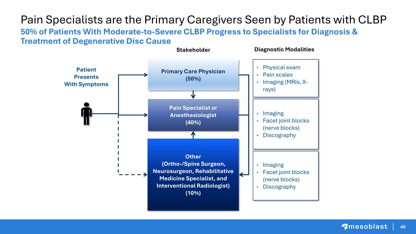 40 Pain Specialists are the Primary Caregivers Seen by Patients with CLBP 50% of Patients With Moderate-to-Severe CLBP Progress to Specialists for Diagnosis & Treatment of Degenerative Disc Cause Primary Care Physician (50%) Other (Ortho-/Spine Surgeon, Neurosurgeon, Rehabilitative Medicine Specialist, and Interventional Radiologist) (10%) Patient Presents With Symptoms Pain Specialist or Anesthesiologist (40%) • Physical exam • Pain scales • Imaging (MRIs, X- rays) • Imaging • Facet joint blocks (nerve blocks) • Discography • Imaging • Facet joint blocks (nerve blocks) • Discography Stakeholder Diagnostic Modalities
