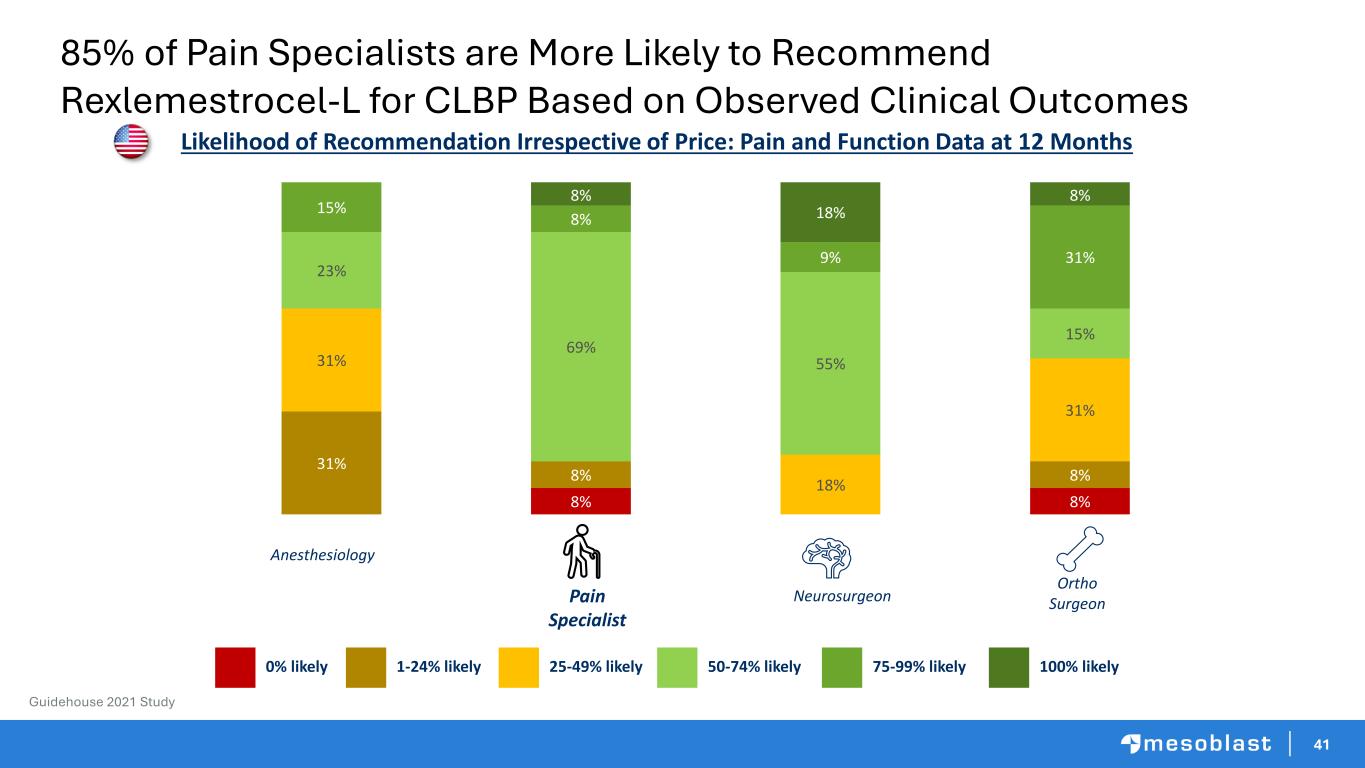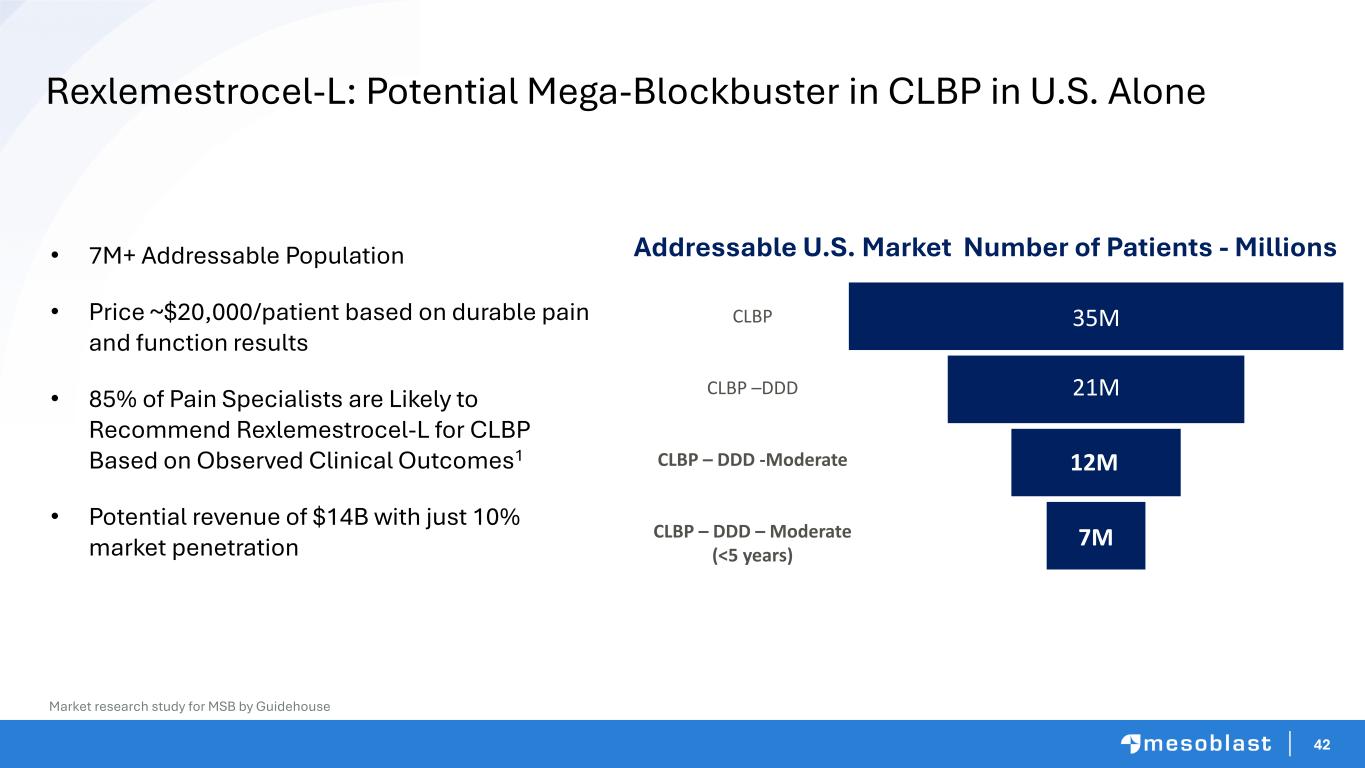 41 Pain Specialist Neurosurgeon Ortho Surgeon 8% 8% 31% 8% 8% 31% 18% 31% 23% 69% 55% 15% 15% 8% 9% 31% 8% 18% 8% Likelihood of Recommendation Irrespective of Price: Pain and Function Data at 12 Months 50-74% likely25-49% likely1-24% likely0% likely 75-99% likely 100% likely Anesthesiology Guidehouse 2021 Study 85% of Pain Specialists are More Likely to Recommend Rexlemestrocel-L for CLBP Based on Observed Clinical Outcomes