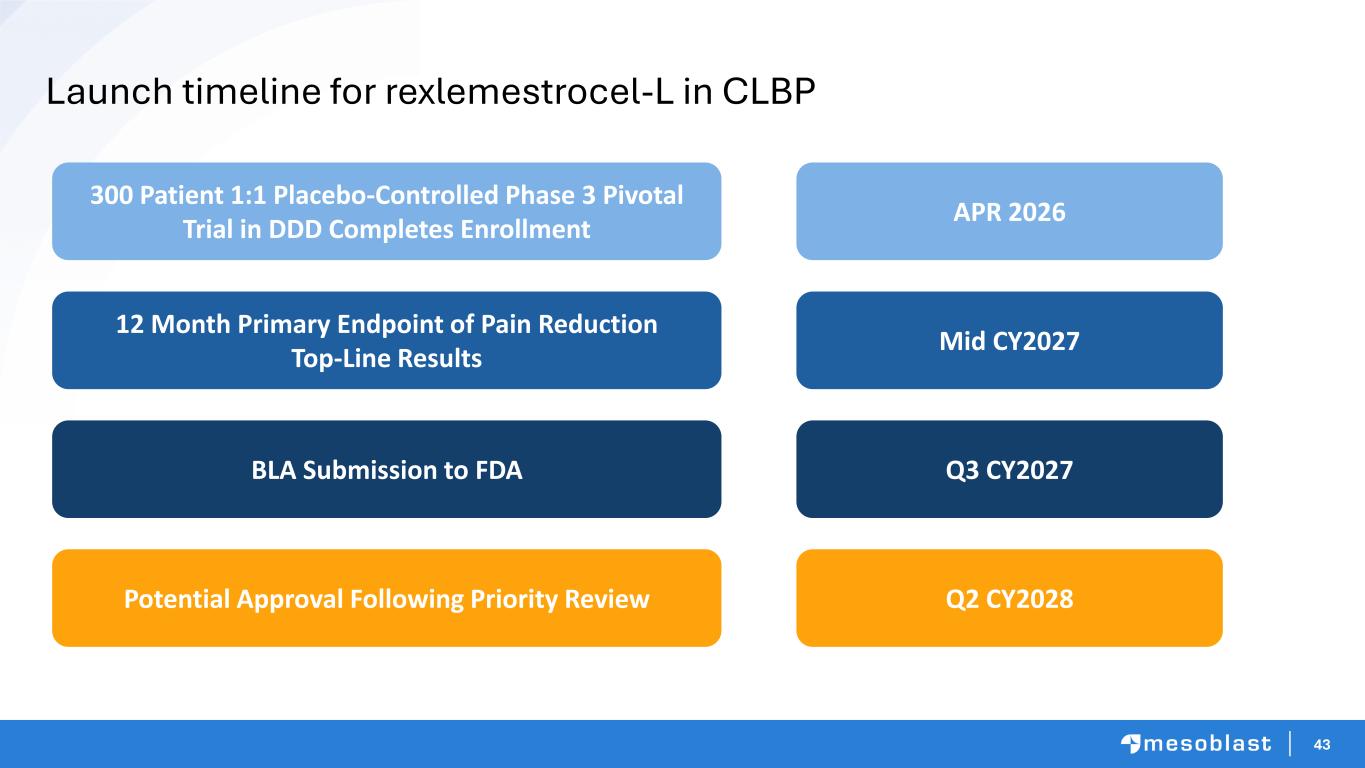 42 • 7M+ Addressable Population • Price ~$20,000/patient based on durable pain and function results • 85% of Pain Specialists are Likely to Recommend Rexlemestrocel-L for CLBP Based on Observed Clinical Outcomes1 • Potential revenue of $14B with just 10% market penetration Market research study for MSB by Guidehouse Rexlemestrocel-L: Potential Mega-Blockbuster in CLBP in U.S. Alone Addressable U.S. Market Number of Patients - Millions 35M 21M 12M 7M CLBP CLBP –DDD CLBP – DDD -Moderate CLBP – DDD – Moderate (<5 years)