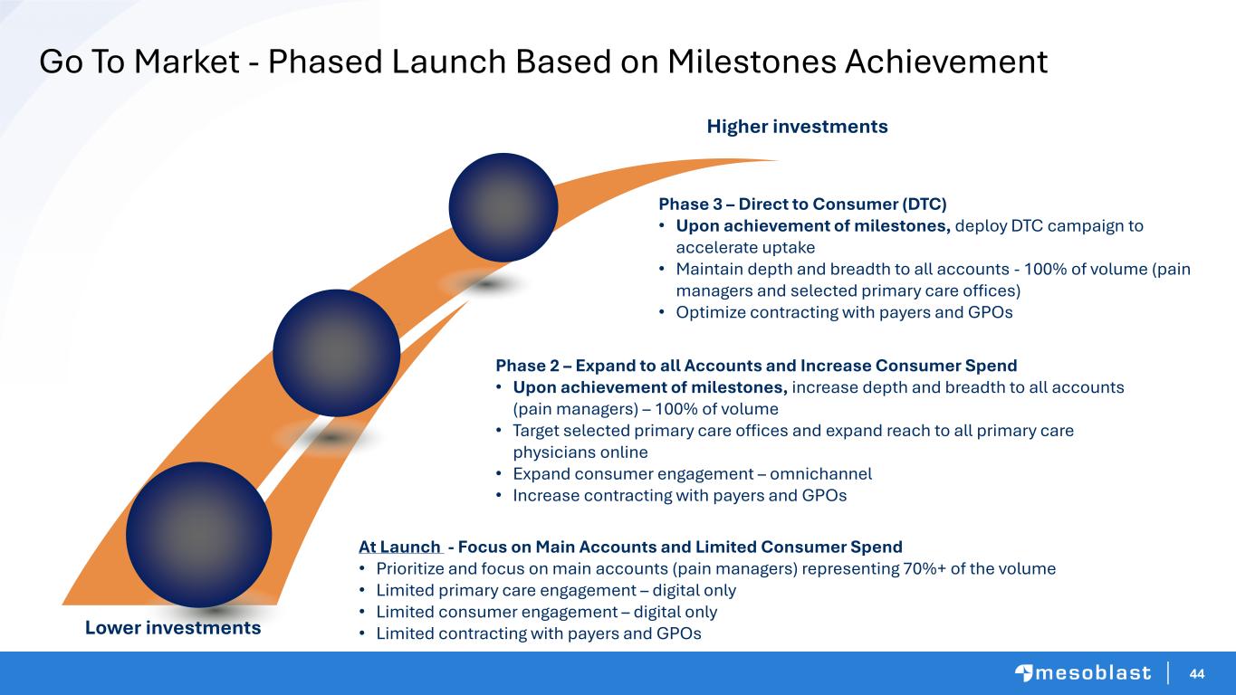 43 Launch timeline for rexlemestrocel-L in CLBP 300 Patient 1:1 Placebo-Controlled Phase 3 Pivotal Trial in DDD Completes Enrollment 12 Month Primary Endpoint of Pain Reduction Top-Line Results BLA Submission to FDA Potential Approval Following Priority Review APR 2026 Mid CY2027 Q3 CY2027 Q2 CY2028