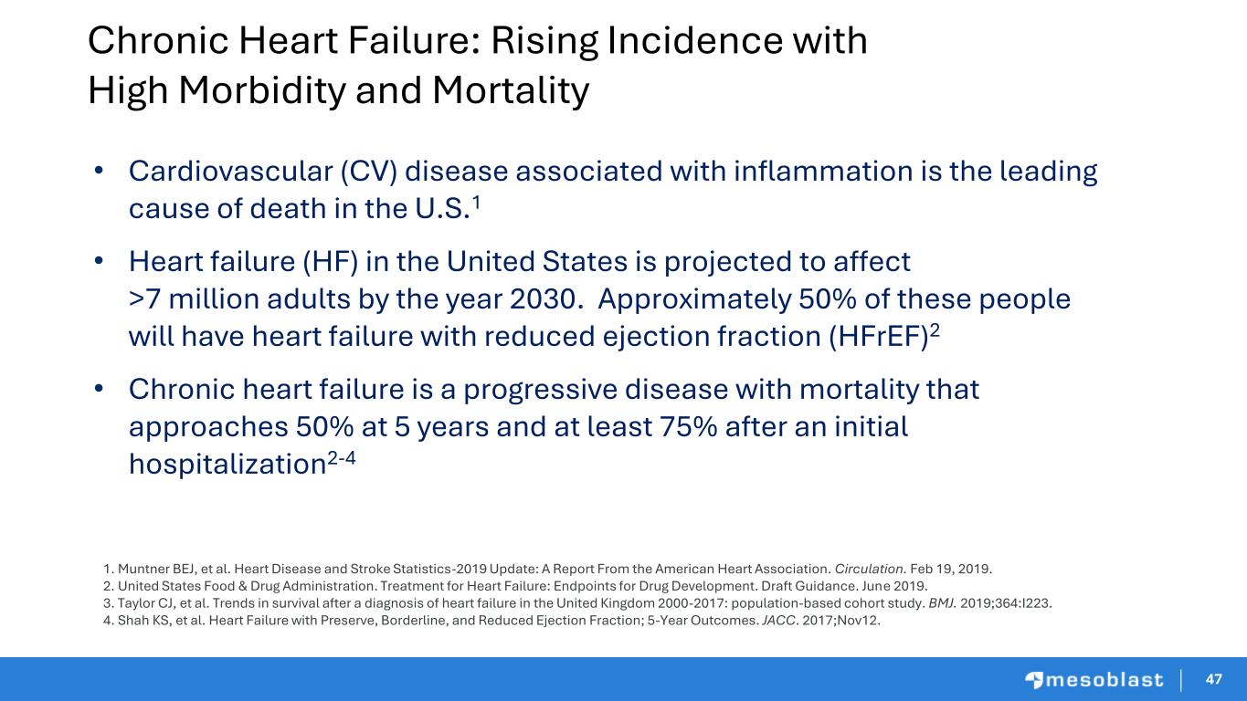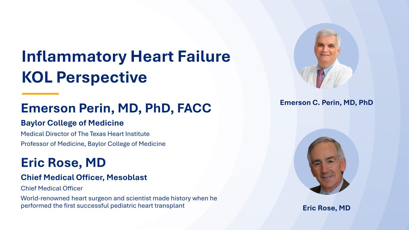 59 59 Inflammatory Heart Failure KOL Perspective Emerson Perin, MD, PhD, FACC Baylor College of Medicine Medical Director of The Texas Heart Institute Professor of Medicine, Baylor College of Medicine Eric Rose, MD Emerson C. Perin, MD, PhD Eric Rose, MD Chief Medical Officer, Mesoblast Chief Medical Officer World-renowned heart surgeon and scientist made history when he performed the first successful pediatric heart transplant