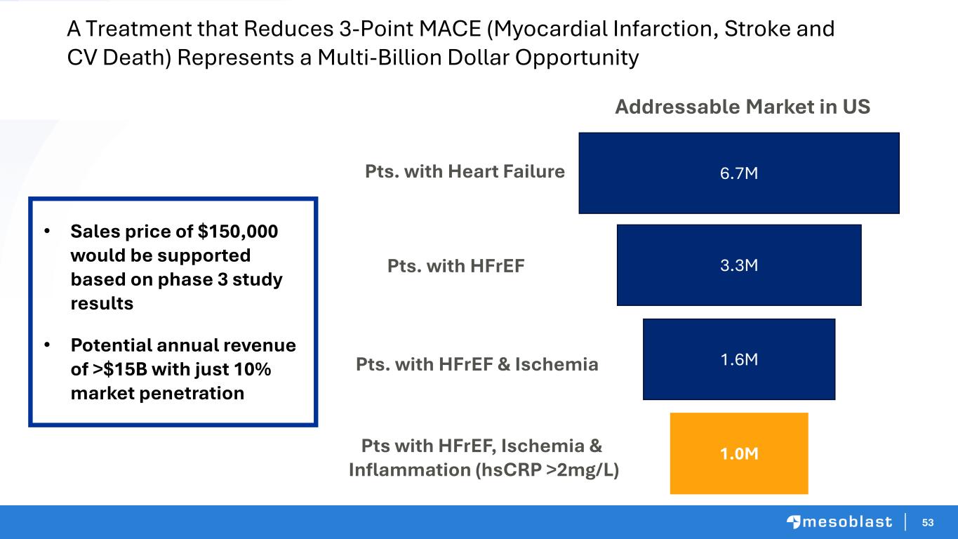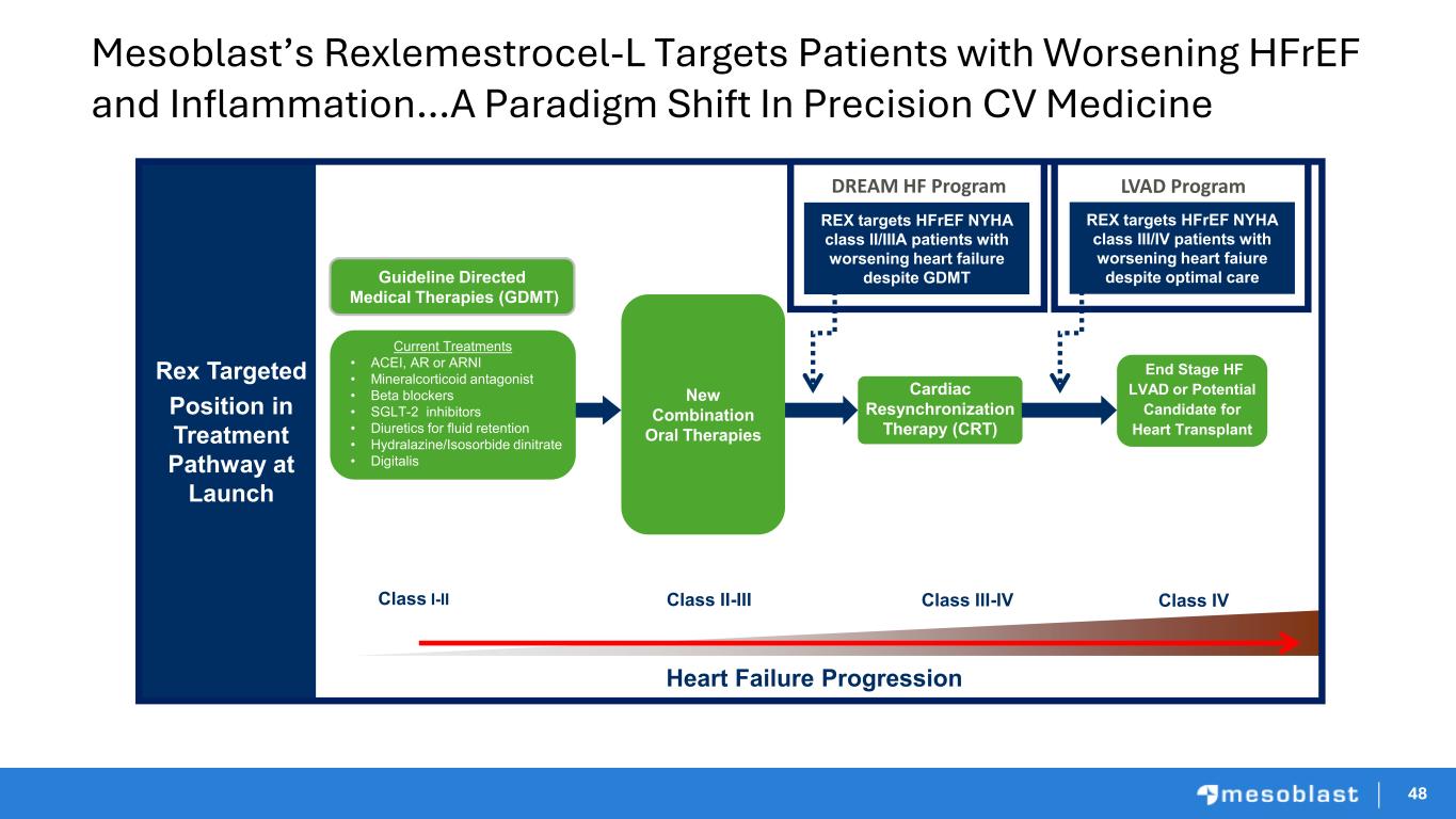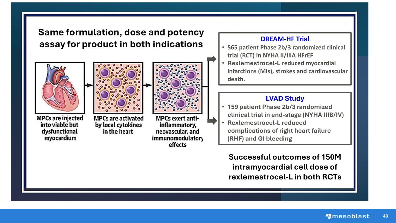 48 Mesoblast’s Rexlemestrocel-L Targets Patients with Worsening HFrEF and Inflammation…A Paradigm Shift In Precision CV Medicine Rex Targeted Position in Treatment Pathway at Launch Heart Failure Progression Class I-II Class IV Current Treatments • ACEI, AR or ARNI • Mineralcorticoid antagonist • Beta blockers • SGLT-2 inhibitors • Diuretics for fluid retention • Hydralazine/Isosorbide dinitrate • Digitalis Cardiac Resynchronization Therapy (CRT) End Stage HF LVAD or Potential Candidate for Heart Transplant Guideline Directed Medical Therapies (GDMT) New Combination Oral Therapies REX targets HFrEF NYHA class II/IIIA patients with worsening heart failure despite GDMT REX targets HFrEF NYHA class III/IV patients with worsening heart faiure despite optimal care Class II-III Class III-IV DREAM HF Program LVAD Program 48