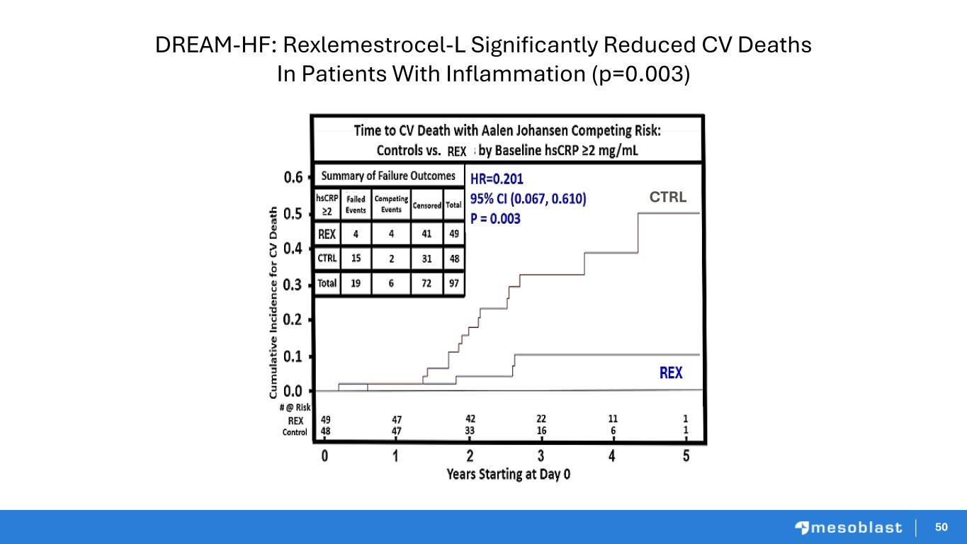 50 DREAM-HF: Rexlemestrocel-L Significantly Reduced CV Deaths In Patients With Inflammation (p=0.003) 50 CTRL