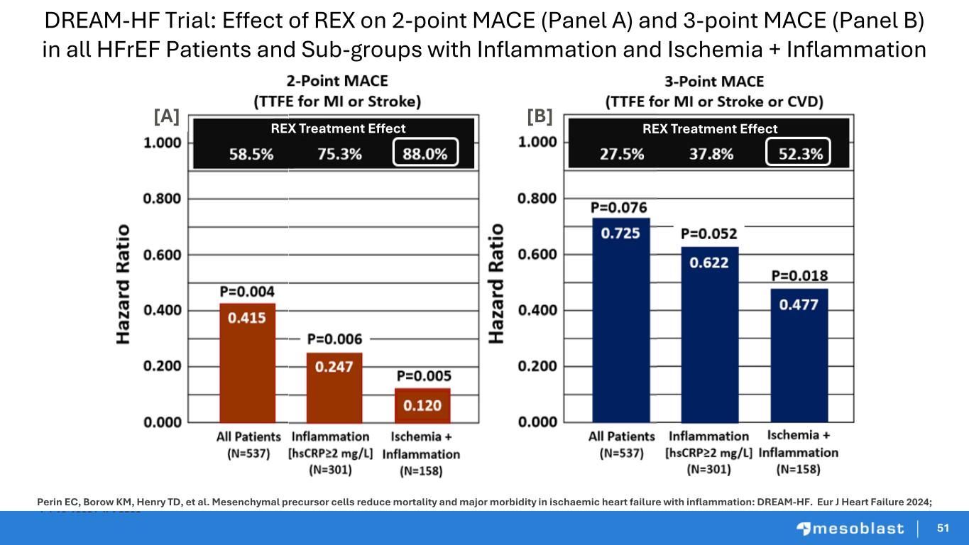 51 Perin EC, Borow KM, Henry TD, et al. Mesenchymal precursor cells reduce mortality and major morbidity in ischaemic heart failure with inflammation: DREAM-HF. Eur J Heart Failure 2024; doi:10.1002/ejhf.3522 [A] [B] REX Treatment EffectREX Treatment Effect DREAM-HF Trial: Effect of REX on 2-point MACE (Panel A) and 3-point MACE (Panel B) in all HFrEF Patients and Sub-groups with Inflammation and Ischemia + Inflammation 51