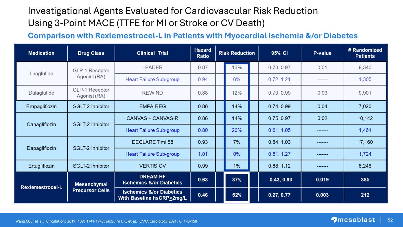 52 Investigational Agents Evaluated for Cardiovascular Risk Reduction Using 3-Point MACE (TTFE for MI or Stroke or CV Death) Comparison with Rexlemestrocel-L in Patients with Myocardial Ischemia &/or Diabetes Wang CCL, et al. Circulation; 2019; 139: 1741-1743; McGuire DK, et al. JAMA Cardiology 2021; 6: 148-158