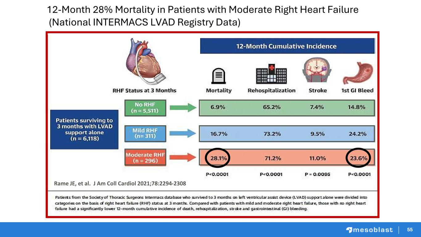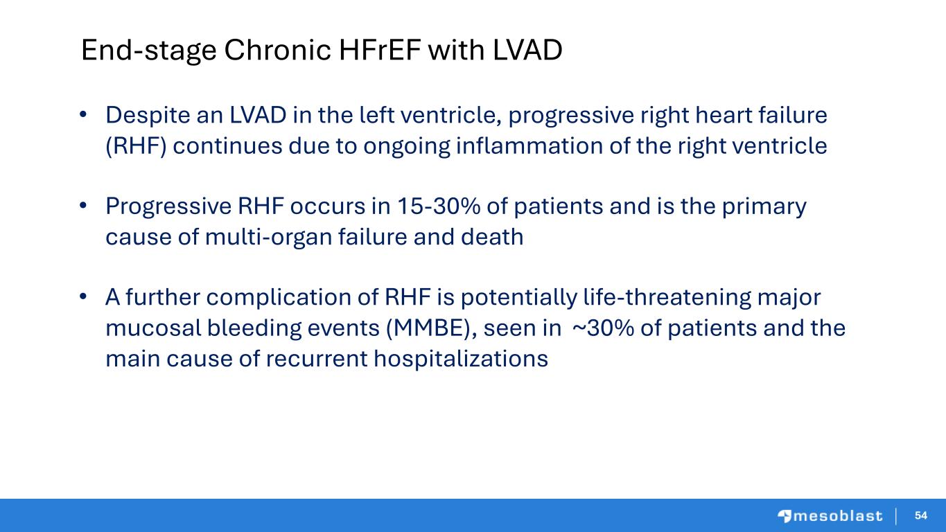 5454 End-stage Chronic HFrEF with LVAD • Despite an LVAD in the left ventricle, progressive right heart failure (RHF) continues due to ongoing inflammation of the right ventricle • Progressive RHF occurs in 15-30% of patients and is the primary cause of multi-organ failure and death • A further complication of RHF is potentially life-threatening major mucosal bleeding events (MMBE), seen in ~30% of patients and the main cause of recurrent hospitalizations