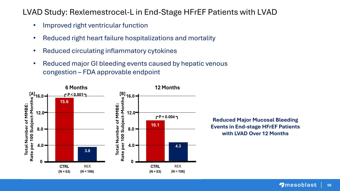 56 LVAD Study: Rexlemestrocel-L in End-Stage HFrEF Patients with LVAD • Improved right ventricular function • Reduced right heart failure hospitalizations and mortality • Reduced circulating inflammatory cytokines • Reduced major GI bleeding events caused by hepatic venous congestion – FDA approvable endpoint Reduced Major Mucosal Bleeding Events in End-stage HFrEF Patients with LVAD Over 12 Months REXREX