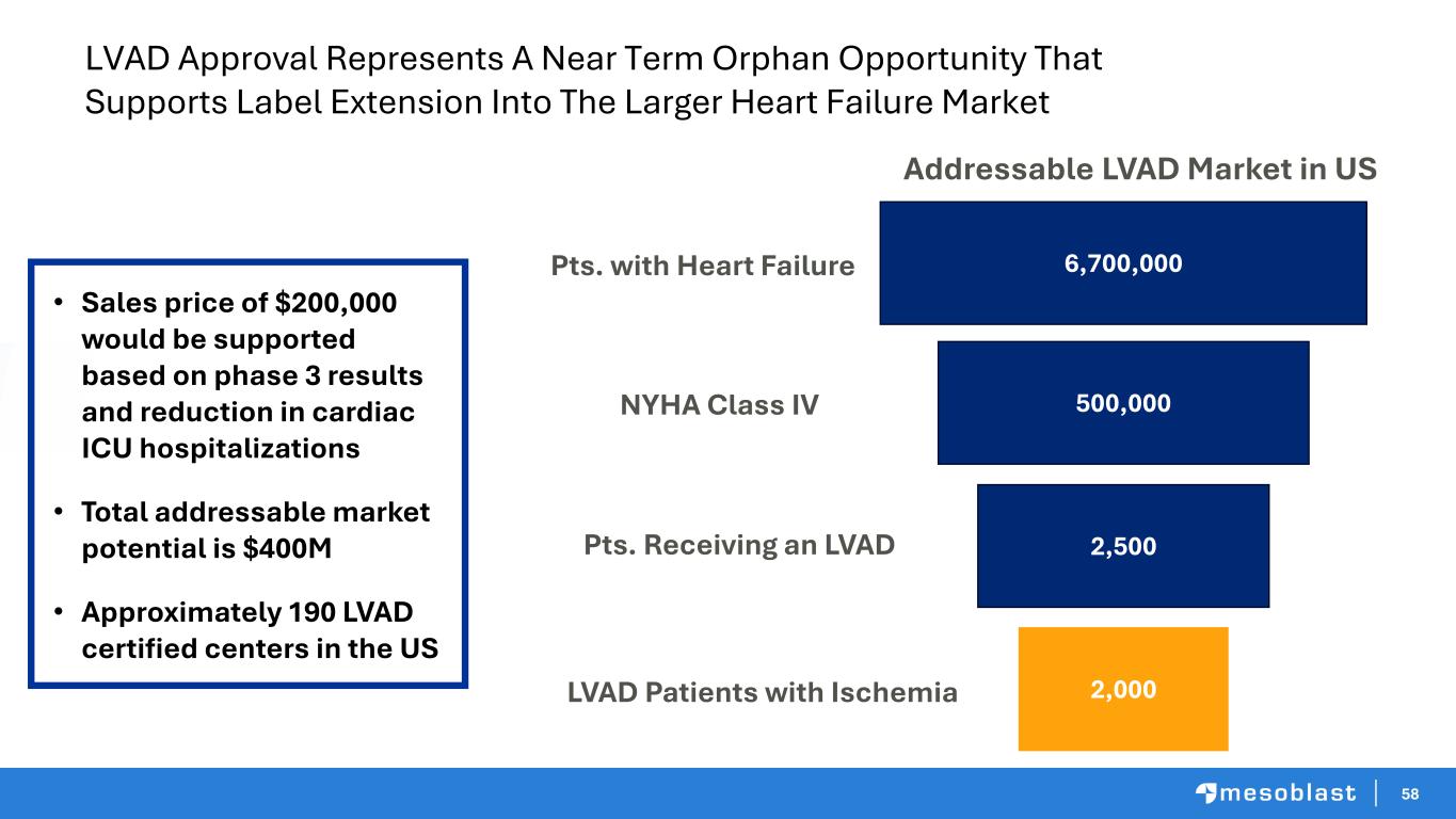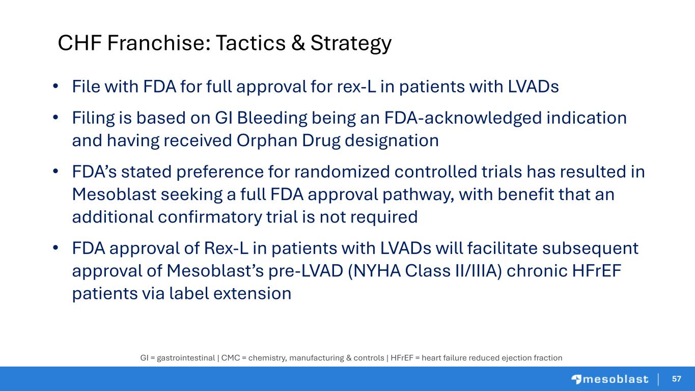 5757 CHF Franchise: Tactics & Strategy • File with FDA for full approval for rex-L in patients with LVADs • Filing is based on GI Bleeding being an FDA-acknowledged indication and having received Orphan Drug designation • FDA’s stated preference for randomized controlled trials has resulted in Mesoblast seeking a full FDA approval pathway, with benefit that an additional confirmatory trial is not required • FDA approval of Rex-L in patients with LVADs will facilitate subsequent approval of Mesoblast’s pre-LVAD (NYHA Class II/IIIA) chronic HFrEF patients via label extension GI = gastrointestinal | CMC = chemistry, manufacturing & controls | HFrEF = heart failure reduced ejection fraction