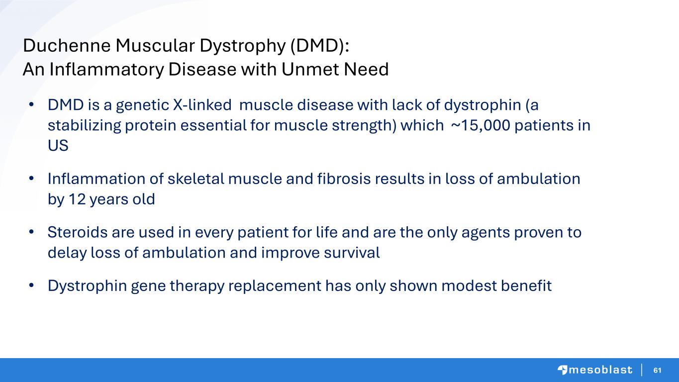 61 • DMD is a genetic X-linked muscle disease with lack of dystrophin (a stabilizing protein essential for muscle strength) which ~15,000 patients in US • Inflammation of skeletal muscle and fibrosis results in loss of ambulation by 12 years old • Steroids are used in every patient for life and are the only agents proven to delay loss of ambulation and improve survival • Dystrophin gene therapy replacement has only shown modest benefit Duchenne Muscular Dystrophy (DMD): An Inflammatory Disease with Unmet Need