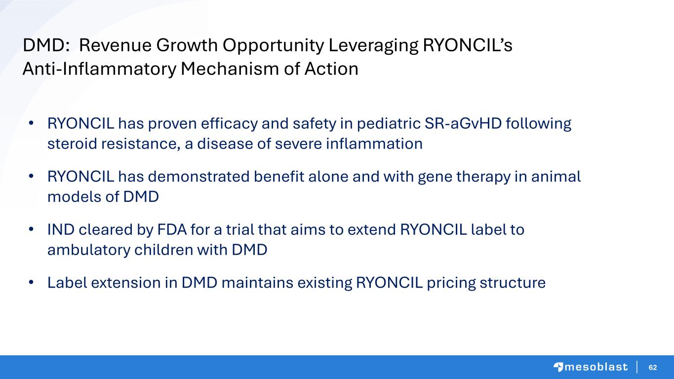 62 • RYONCIL has proven efficacy and safety in pediatric SR-aGvHD following steroid resistance, a disease of severe inflammation • RYONCIL has demonstrated benefit alone and with gene therapy in animal models of DMD • IND cleared by FDA for a trial that aims to extend RYONCIL label to ambulatory children with DMD • Label extension in DMD maintains existing RYONCIL pricing structure DMD: Revenue Growth Opportunity Leveraging RYONCIL’s Anti-Inflammatory Mechanism of Action