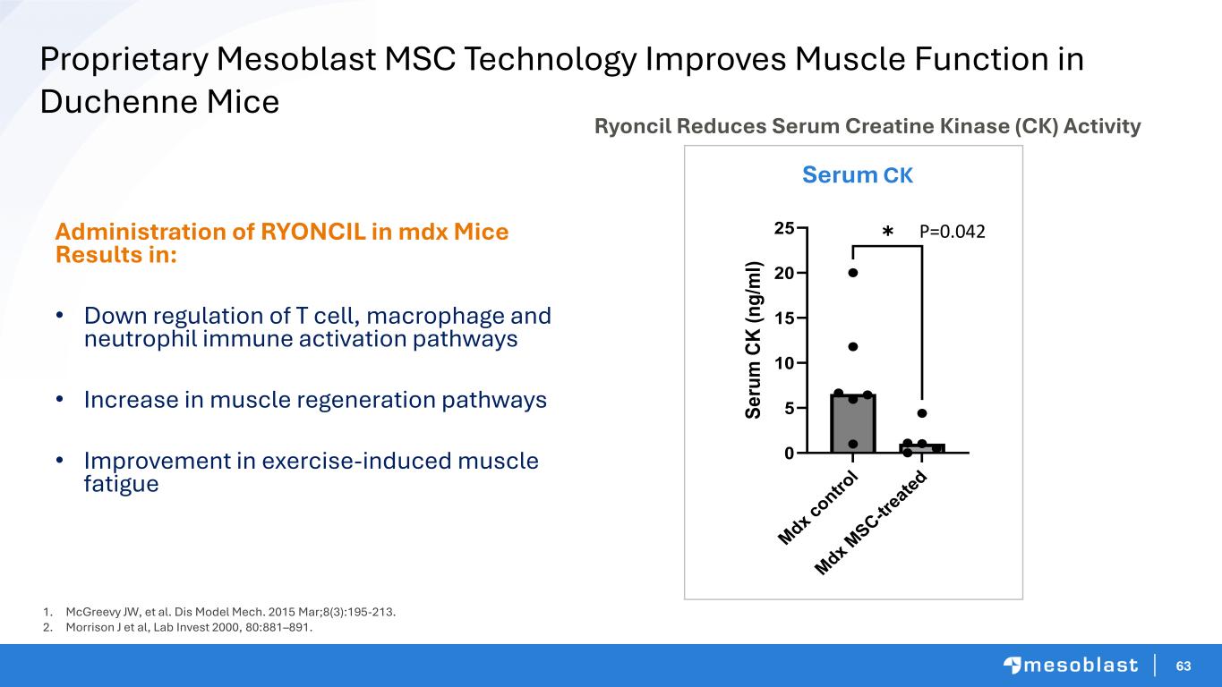 63 1. McGreevy JW, et al. Dis Model Mech. 2015 Mar;8(3):195-213. 2. Morrison J et al, Lab Invest 2000, 80:881–891. Administration of RYONCIL in mdx Mice Results in: • Down regulation of T cell, macrophage and neutrophil immune activation pathways • Increase in muscle regeneration pathways • Improvement in exercise-induced muscle fatigue Proprietary Mesoblast MSC Technology Improves Muscle Function in Duchenne Mice Serum CK M dx co ntr ol M dx M SC -tr ea te d 0 5 10 15 20 25 Serum creatine kinase (CK) levels Day 36 (14 days post last dose) S e ru m C K ( n g /m l) ✱ P=0.042 Ryoncil Reduces Serum Creatine Kinase (CK) Activity