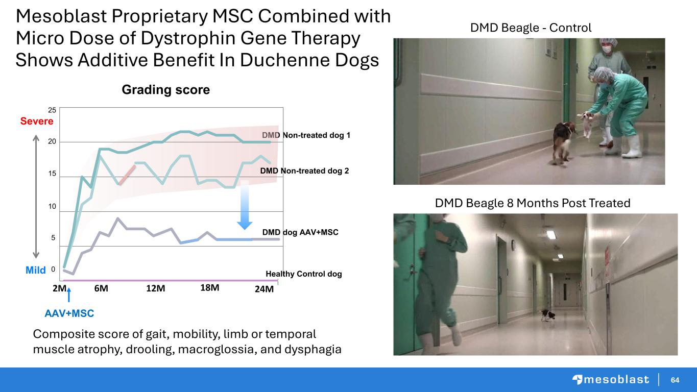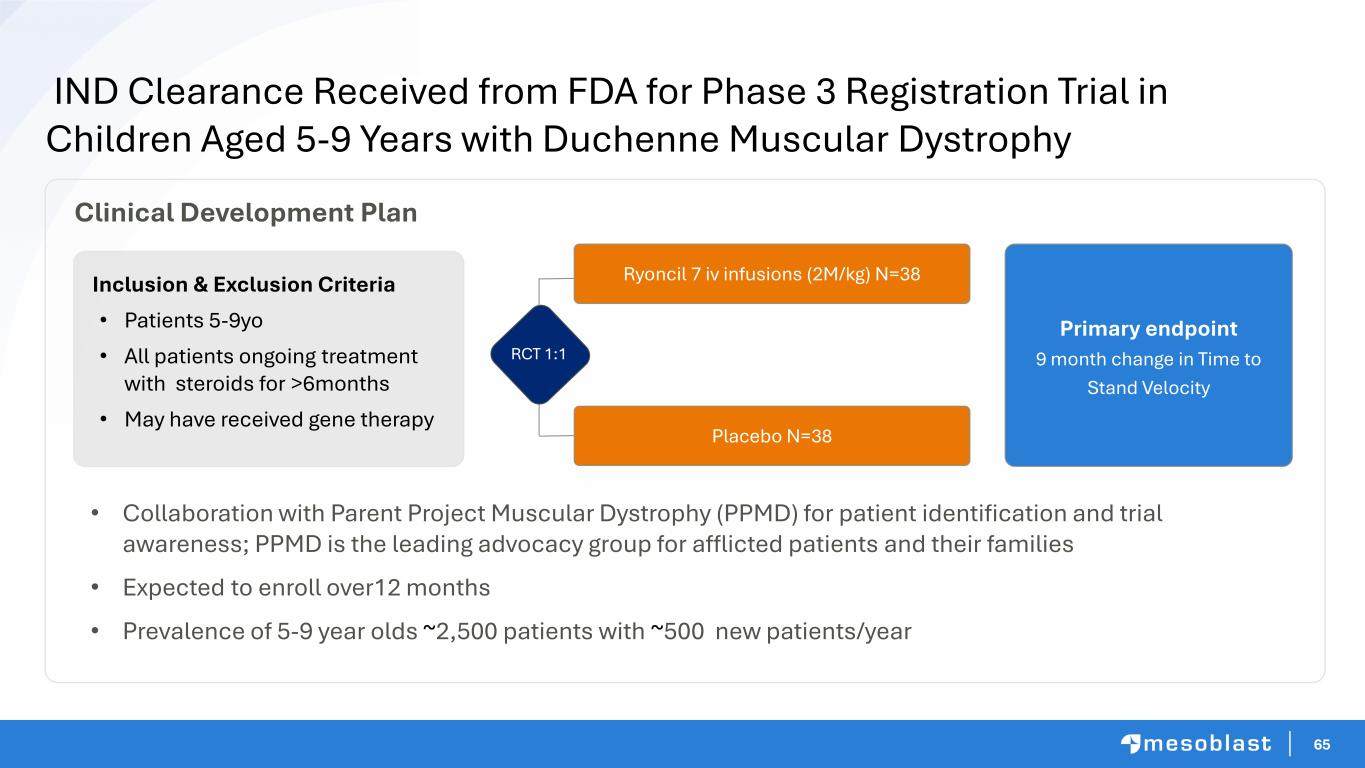 64 Mesoblast Proprietary MSC Combined with Micro Dose of Dystrophin Gene Therapy Shows Additive Benefit In Duchenne Dogs DMD Beagle - Control DMD Beagle 8 Months Post Treated Composite score of gait, mobility, limb or temporal muscle atrophy, drooling, macroglossia, and dysphagia Grading score HC DMD Non-treated dog 1 Severe Mild 6M 12M 18M 24M DMD dog AAV+MSC 0 5 10 15 20 25 2M AAV+MSC DMD Non-treated dog 2 Healthy Control dog