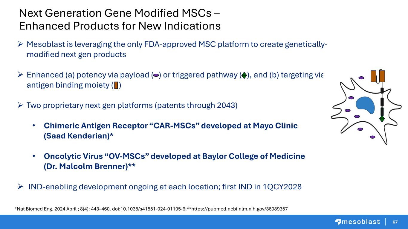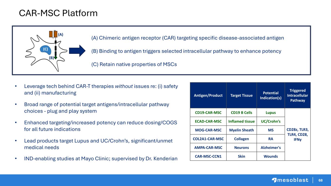 67 ➢ Mesoblast is leveraging the only FDA-approved MSC platform to create genetically- modified next gen products ➢ Enhanced (a) potency via payload ( ) or triggered pathway ( ), and (b) targeting via antigen binding moiety ( ) ➢ Two proprietary next gen platforms (patents through 2043) • Chimeric Antigen Receptor “CAR-MSCs” developed at Mayo Clinic (Dr. Dr. (Saad Kenderian)* • Oncolytic Virus “OV-MSCs” developed at Baylor College of Medicine (Dr. Malcolm Brenner)** ➢ IND-enabling development ongoing at each location; first IND in 1QCY2028 Next Generation Gene Modified MSCs – Enhanced Products for New Indications *Nat Biomed Eng. 2024 April ; 8(4): 443–460. doi:10.1038/s41551-024-01195-6;**https://pubmed.ncbi.nlm.nih.gov/36989357