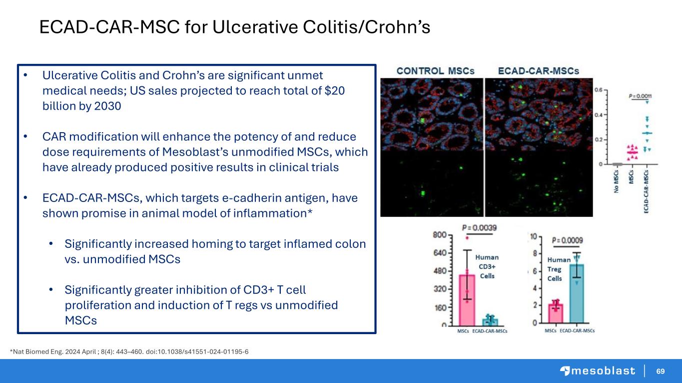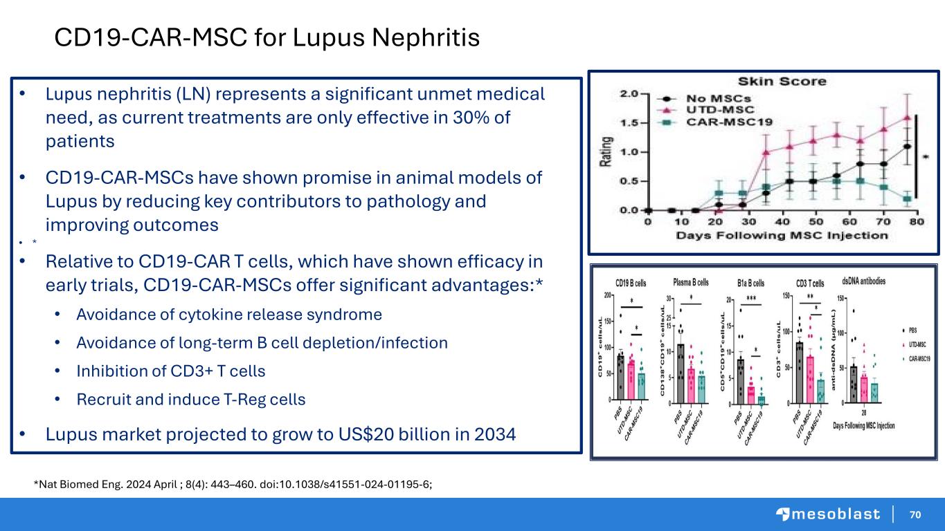 69 ECAD-CAR-MSC for Ulcerative Colitis/Crohn’s • Ulcerative Colitis and Crohn’s are significant unmet medical needs; US sales projected to reach total of $20 billion by 2030 • CAR modification will enhance the potency of and reduce dose requirements of Mesoblast’s unmodified MSCs, which have already produced positive results in clinical trials • ECAD-CAR-MSCs, which targets e-cadherin antigen, have shown promise in animal model of inflammation* • Significantly increased homing to target inflamed colon vs. unmodified MSCs • Significantly greater inhibition of CD3+ T cell proliferation and induction of T regs vs unmodified MSCs *Nat Biomed Eng. 2024 April ; 8(4): 443–460. doi:10.1038/s41551-024-01195-6