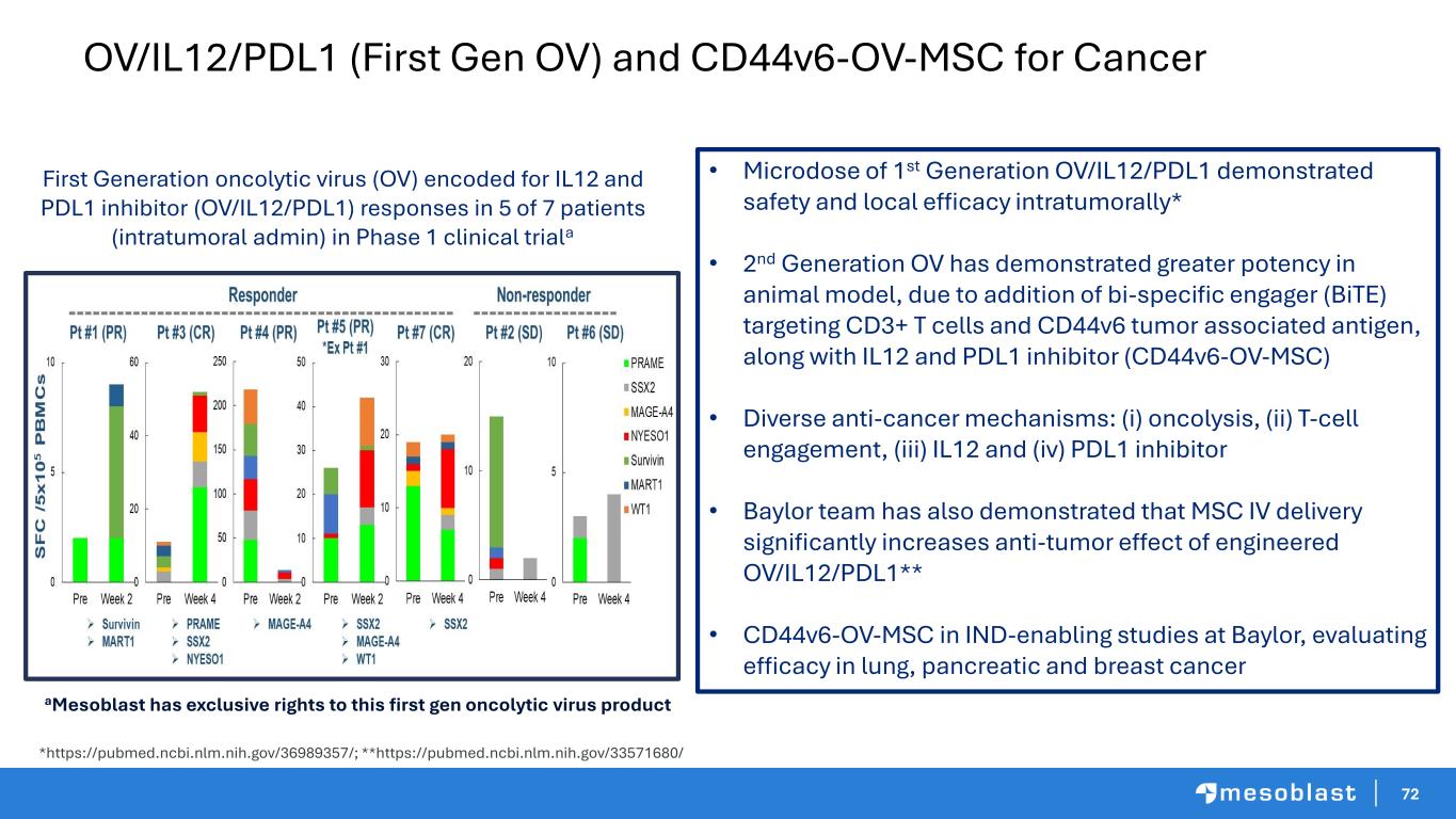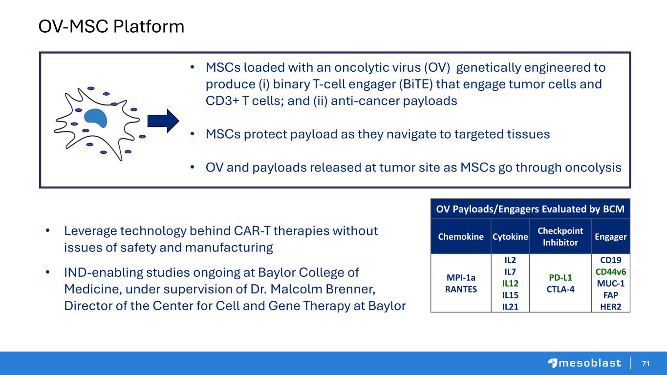 71 OV-MSC Platform • Leverage technology behind CAR-T therapies without issues of safety and manufacturing • IND-enabling studies ongoing at Baylor College of Medicine, under supervision of Dr. Malcolm Brenner, Director of the Center for Cell and Gene Therapy at Baylor OV Payloads/Engagers Evaluated by BCM Chemokine Cytokine Checkpoint Inhibitor Engager MPI-1a RANTES IL2 IL7 IL12 IL15 IL21 PD-L1 CTLA-4 CD19 CD44v6 MUC-1 FAP HER2 • MSCs loaded with an oncolytic virus (OV) genetically engineered to produce (i) binary T-cell engager (BiTE) that engage tumor cells and CD3+ T cells; and (ii) anti-cancer payloads • MSCs protect payload as they navigate to targeted tissues • OV and payloads released at tumor site as MSCs go through oncolysis