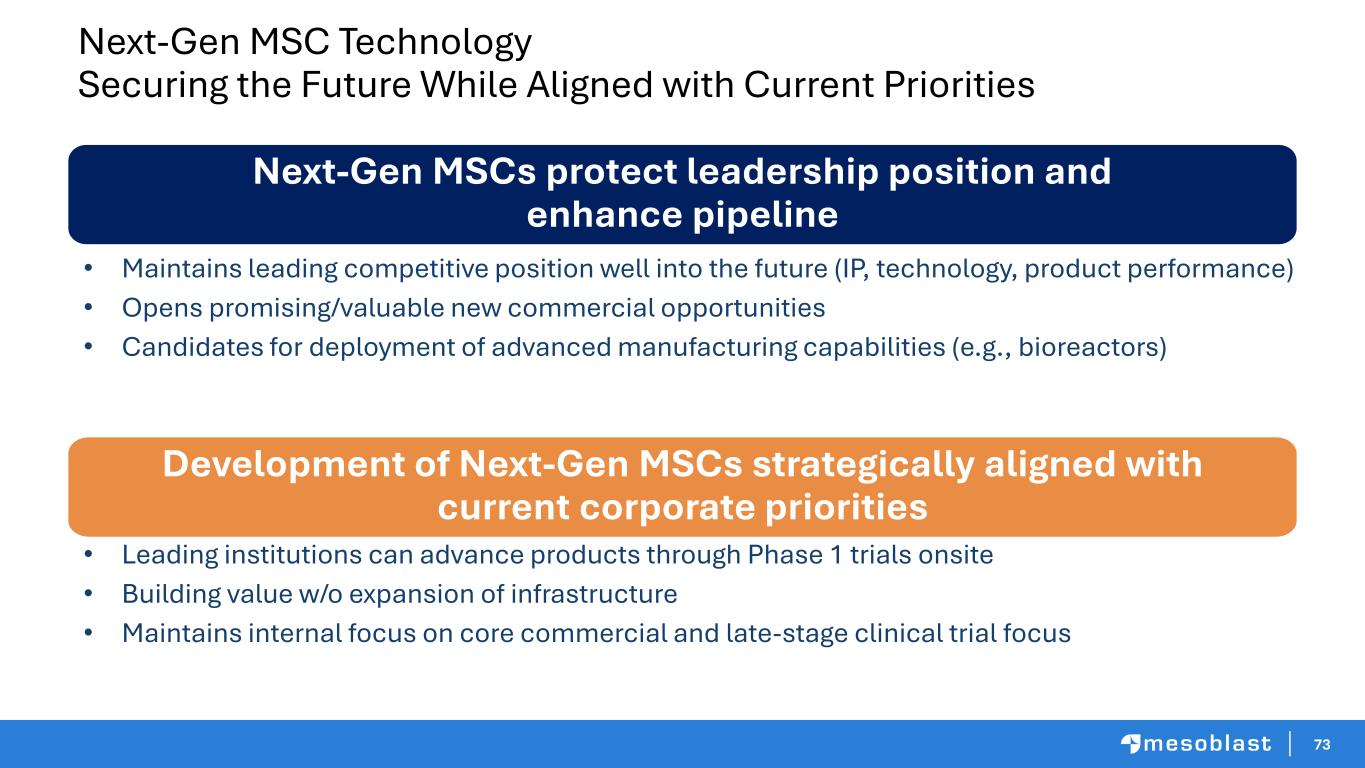 72 OV/IL12/PDL1 (First Gen OV) and CD44v6-OV-MSC for Cancer *https://pubmed.ncbi.nlm.nih.gov/36989357/; **https://pubmed.ncbi.nlm.nih.gov/33571680/ First Generation oncolytic virus (OV) encoded for IL12 and PDL1 inhibitor (OV/IL12/PDL1) responses in 5 of 7 patients (intratumoral admin) in Phase 1 clinical triala aMesoblast has exclusive rights to this first gen oncolytic virus product • Microdose of 1st Generation OV/IL12/PDL1 demonstrated safety and local efficacy intratumorally* • 2nd Generation OV has demonstrated greater potency in animal model, due to addition of bi-specific engager (BiTE) targeting CD3+ T cells and CD44v6 tumor associated antigen, along with IL12 and PDL1 inhibitor (CD44v6-OV-MSC) • Diverse anti-cancer mechanisms: (i) oncolysis, (ii) T-cell engagement, (iii) IL12 and (iv) PDL1 inhibitor • Baylor team has also demonstrated that MSC IV delivery significantly increases anti-tumor effect of engineered OV/IL12/PDL1** • CD44v6-OV-MSC in IND-enabling studies at Baylor, evaluating efficacy in lung, pancreatic and breast cancer