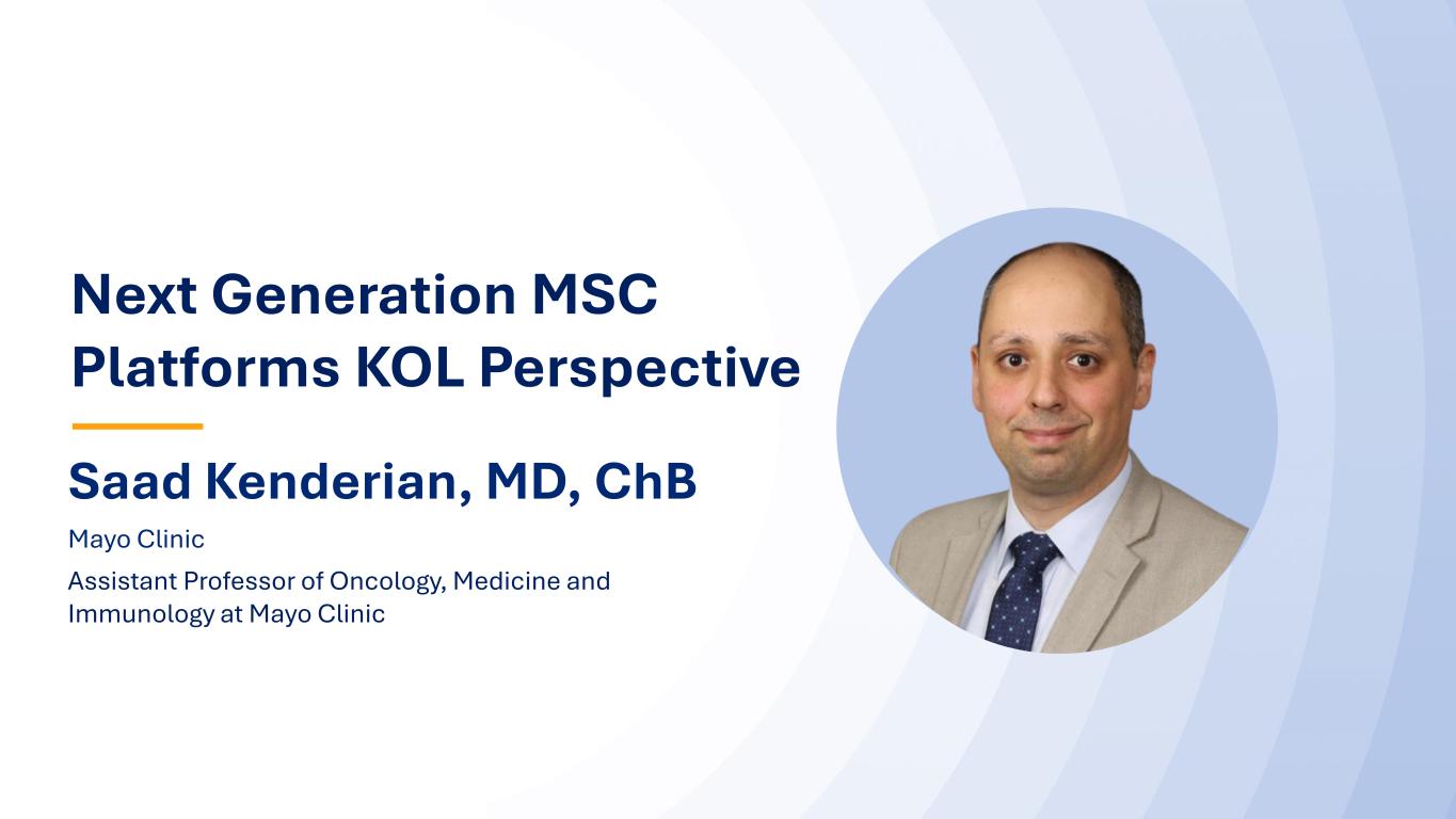 7474 Saad Kenderian, MD, ChB Mayo Clinic Assistant Professor of Oncology, Medicine and Immunology at Mayo Clinic Next Generation MSC Platforms KOL Perspective