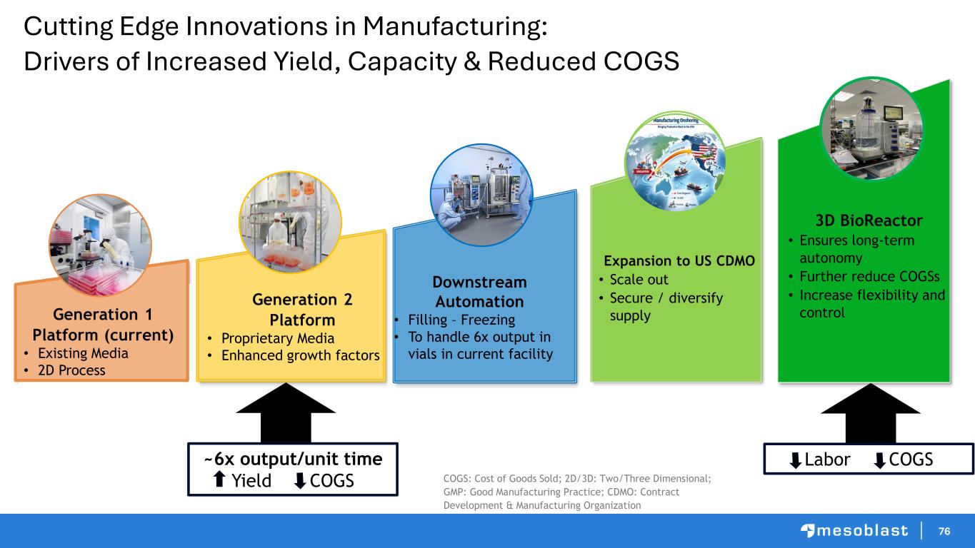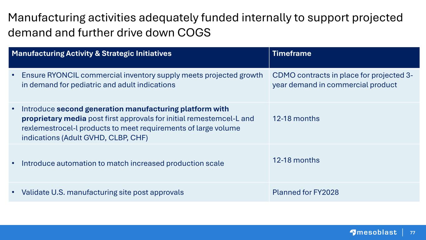 76 Cutting Edge Innovations in Manufacturing: Drivers of Increased Yield, Capacity & Reduced COGS Generation 2 Platform • Proprietary Media • Enhanced growth factors Expansion to US CDMO • Scale out • Secure / diversify supply 3D BioReactor • Ensures long-term autonomy • Further reduce COGSs • Increase flexibility and controlGeneration 1 Platform (current) • Existing Media • 2D Process Downstream Automation • Filling – Freezing • To handle 6x output in vials in current facility ~6x output/unit time Yield COGS COGS: Cost of Goods Sold; 2D/3D: Two/Three Dimensional; GMP: Good Manufacturing Practice; CDMO: Contract Development & Manufacturing Organization Labor COGS