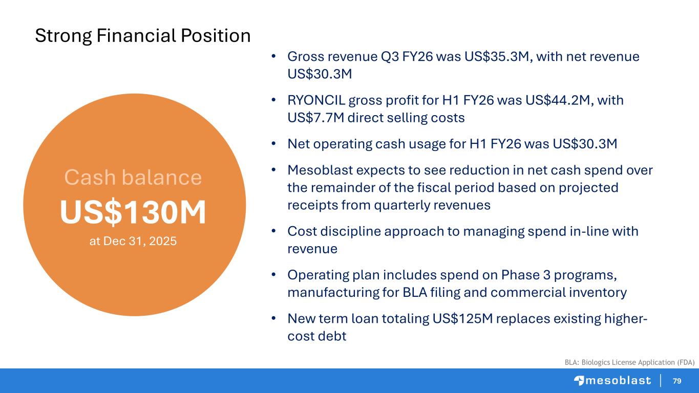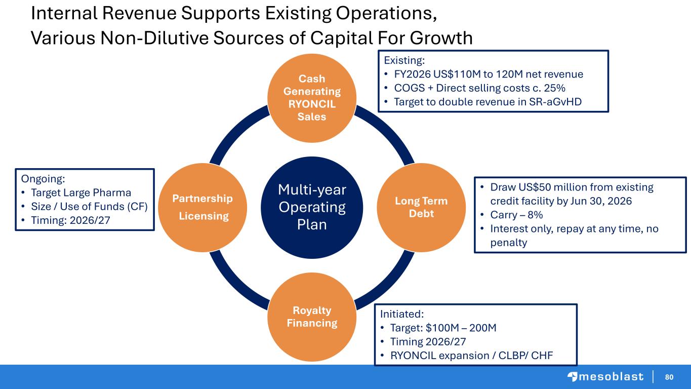79 Strong Financial Position • Gross revenue Q3 FY26 was US$35.3M, with net revenue US$30.3M • RYONCIL gross profit for H1 FY26 was US$44.2M, with US$7.7M direct selling costs • Net operating cash usage for H1 FY26 was US$30.3M • Mesoblast expects to see reduction in net cash spend over the remainder of the fiscal period based on projected receipts from quarterly revenues • Cost discipline approach to managing spend in-line with revenue • Operating plan includes spend on Phase 3 programs, manufacturing for BLA filing and commercial inventory • New term loan totaling US$125M replaces existing higher- cost debt Cash balance US$130M at Dec 31, 2025 BLA: Biologics License Application (FDA)