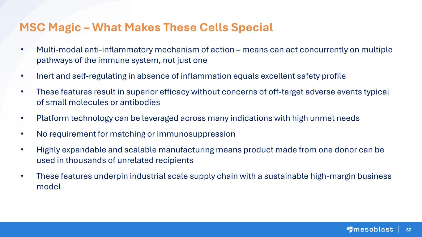 82 • Multi-modal anti-inflammatory mechanism of action – means can act concurrently on multiple pathways of the immune system, not just one • Inert and self-regulating in absence of inflammation equals excellent safety profile • These features result in superior efficacy without concerns of off-target adverse events typical of small molecules or antibodies • Platform technology can be leveraged across many indications with high unmet needs • No requirement for matching or immunosuppression • Highly expandable and scalable manufacturing means product made from one donor can be used in thousands of unrelated recipients • These features underpin industrial scale supply chain with a sustainable high-margin business model MSC Magic – What Makes These Cells Special