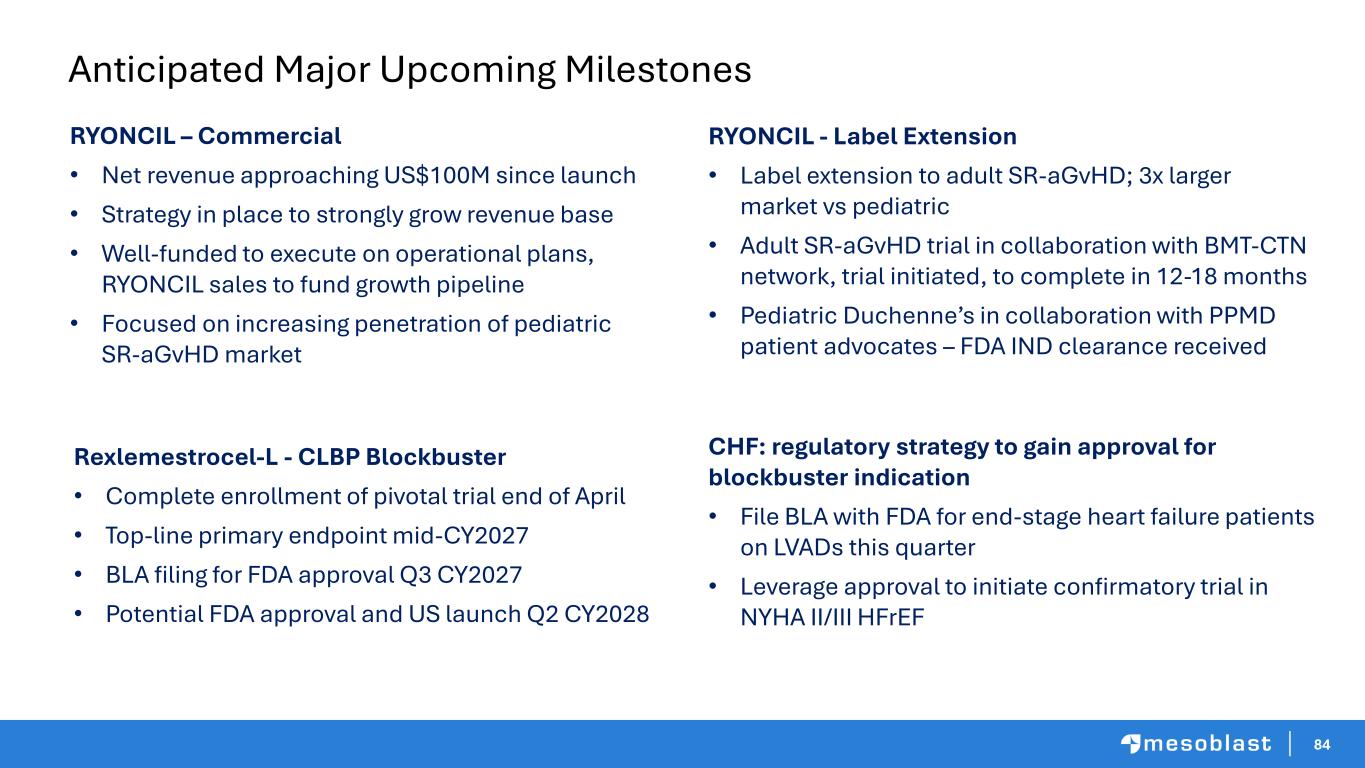 83 • Globally IP portfolio >1,100 patents provide protection through >2044 • Dominant IP protects a cell type whose unique properties underpin a scalable commercial business model • First mover advantage – the first and only MSC approved by FDA • Completed large, US-based, randomized clinical trials which provide evidence of efficacy • Benchmark in complex manufacturing with IP protection, significant know-how advantage, demonstrated FDA alignment, scale-up capacity, and ability to leverage across many products • Next gen technology leadership to enhance tissue-homing characteristics and achieve even greater efficacy for existing products in areas such as inflammatory bowel disease, lupus nephritis and Alzheimer’s disease, and completely open new areas such as cancer Our ‘MOAT’ – What Sets Mesoblast Apart and Protects Our Market Leadership Position