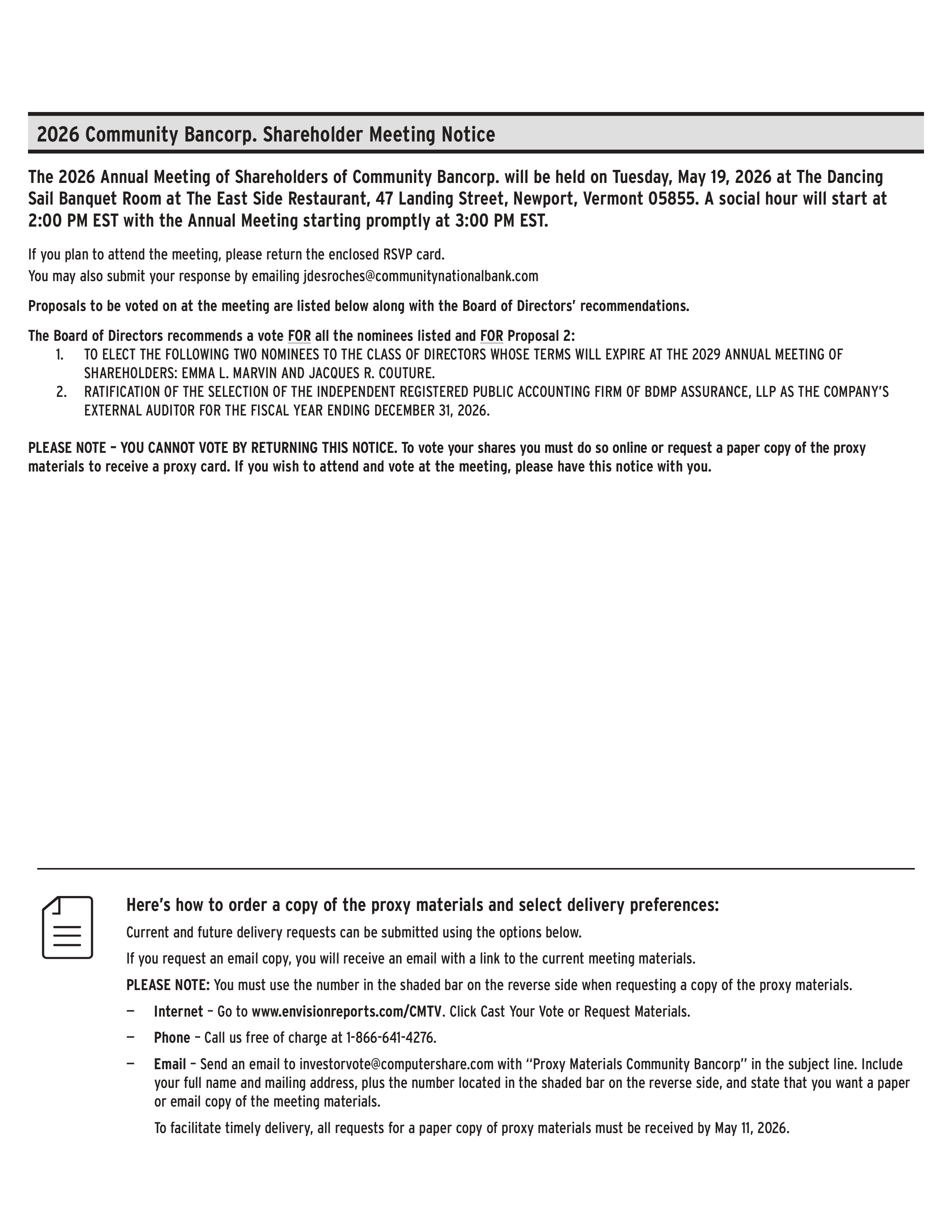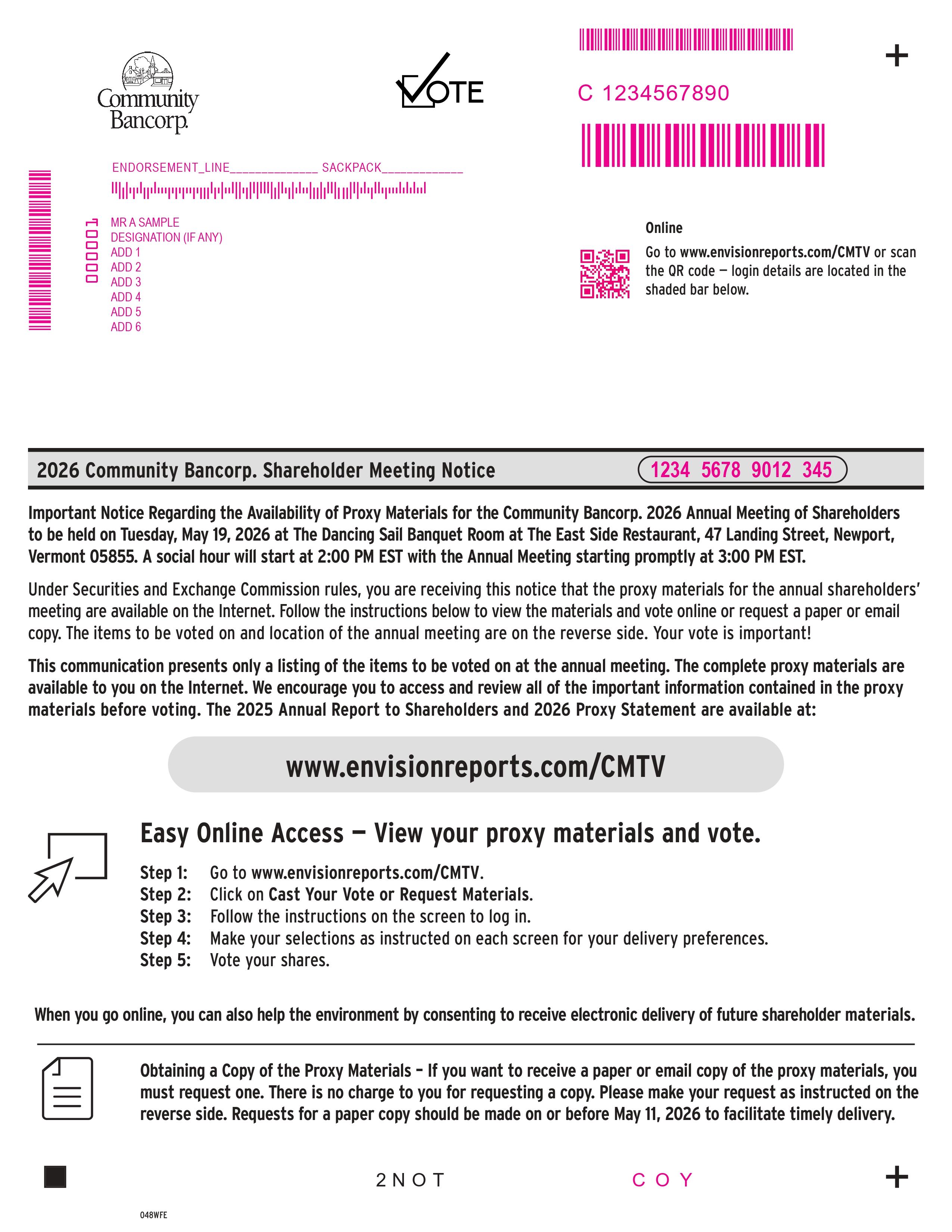 Here’s how to order a copy of the proxy materials and select delivery preferences: Current and future delivery requests can be submitted using the options below. If you request an email copy, you will receive an email with a link to the current meeting materials. PLEASE NOTE: You must use the number in the shaded bar on the reverse side when requesting a copy of the proxy materials. — Internet – Go to www.envisionreports.com/CMTV . Click Cast Your Vote or Request Materials. — Phone – Call us free of charge at 1 - 866 - 641 - 4276. — Email – Send an email to investorvote@computershare . com with “Proxy Materials Community Bancorp”” in the subject line . Include your full name and mailing address, plus the number located in the shaded bar on the reverse side, and state that you want a paper copy of the meeting materials . To facilitate timely delivery, all requests for a paper copy of proxy materials must be received by May 9 , 2025 . 2025 Community Bancorp. Shareholder Meeting Notice The 2025 Annual Meeting of Shareholders of Community Bancorp. will be held on Tuesday, May 20, 2025 at The East Side Restaurant, 47 Landing Street, Newport, Vermont 05855. The social hour will start promptly at 2:00pm ET and the annual meeting will start promptly at 3:00pm ET. Proposals to be voted on at the meeting are listed below along with the Board of Directors’ recommendations. The Board of Directors recommends a vote FOR all the nominees listed, FOR Proposals 2 and 4 and FOR a 3 year frequency on Proposal 3: 1. TO ELECT THE FOLLOWING FIVE NOMINEES TO THE CLASS OF DIRECTORS WHOSE TERMS WILL EXPIRE AT THE 2028 ANNUAL MEETING OF SHAREHOLDERS: DAVID P. LAFORCE, WAYNE A. LAMBERTON, STEPHEN P. MARSH, CAROL A. MARTIN AND JEFFREY L. MOORE. 2. ADVISORY VOTE TO APPROVE EXECUTIVE COMPENSATION. 3. ADVISORY VOTE ON FREQUENCY OF FUTURE ADVISORY VOTES ON EXECUTIVE COMPENSATION (1, 2 OR 3 YEARS). 4. TO RATIFY THE SELECTION OF THE INDEPENDENT REGISTERED PUBLIC ACCOUNT FIRM OF BERRY, DUNN, MCNEIL & PARKER, LLC AS THE COMPANY’S EXTERNAL AUDITOR FOR THE FISCAL YEAR ENDING DECEMBER 31, 2025. PLEASE NOTE – YOU CANNOT VOTE BY RETURNING THIS NOTICE. To vote your shares you must do so online or request a paper copy of the proxy materials to receive a proxy card. If you wish to attend and vote at the meeting, please have this notice with you.