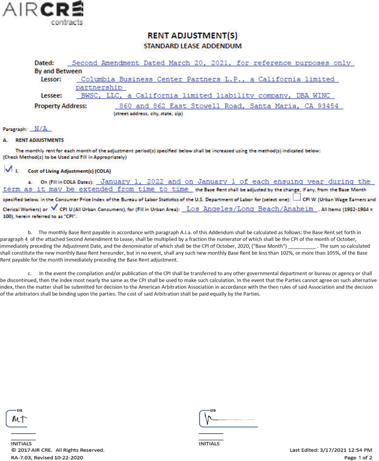 THIS SECOND AMENDMENT TO STANDARD INDUSTRIAL/COMERCIAL MULTI-TENANT LEASE - GROSS is made and entered into at Santa Maria, California dated the 20th day of March, 2021, for reference purposes only, by and between Columbia Business Center Partners L.P., a California limited partnership (“Lessor”), and BWSC, LLC, a California limited liability company DBA WINC (“Lessee”), with reference to the following facts: