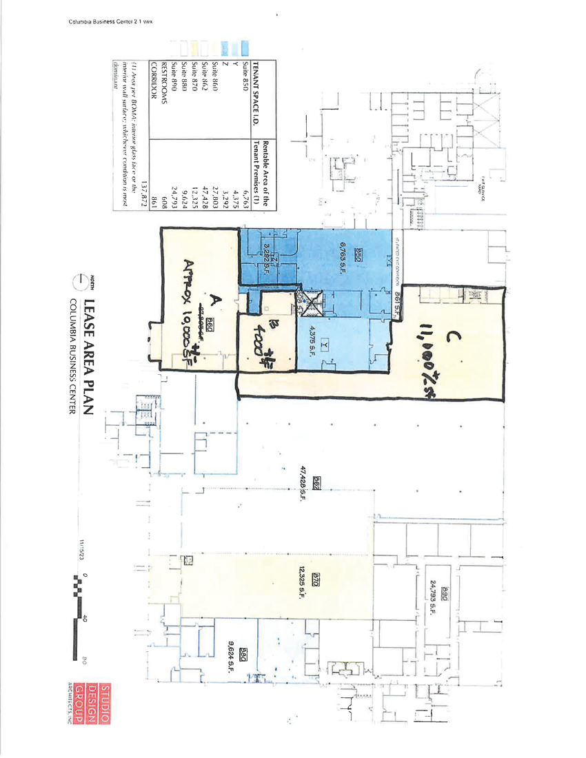 | a. | Lessor will promptly use commercially reasonable efforts to find one or more tenants to rent portions of the Premises in place of Lessee, up to a total maximum of approximately 25,000 - 27,000 sf of the Premises. This approximately 25,000 - 27,000 sf portion of the Premises is depicted on the Exhibit attached hereto and is divided into three (3) sections denoted as “A,” “B,” and “C.” Lessee acknowledges that (i) these depictions are only examples and approximations of the portions that Lessor could rent to other tenants, and (ii) the exact dimensions of any portion of the Premises rented to other tenants will only be determined at the time a lease with a new tenant is executed by Lessor. |