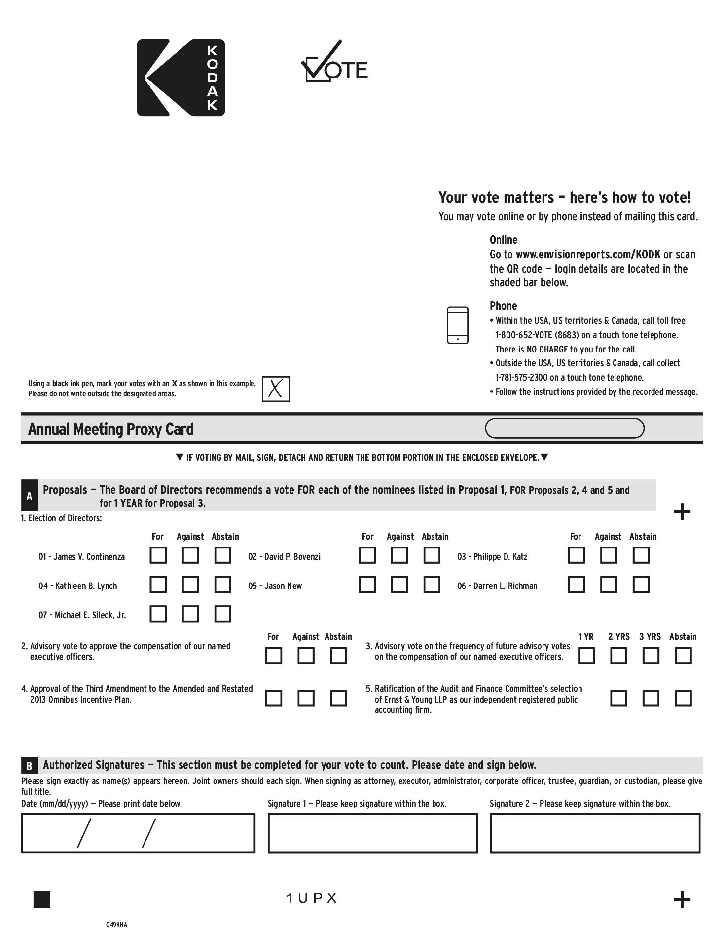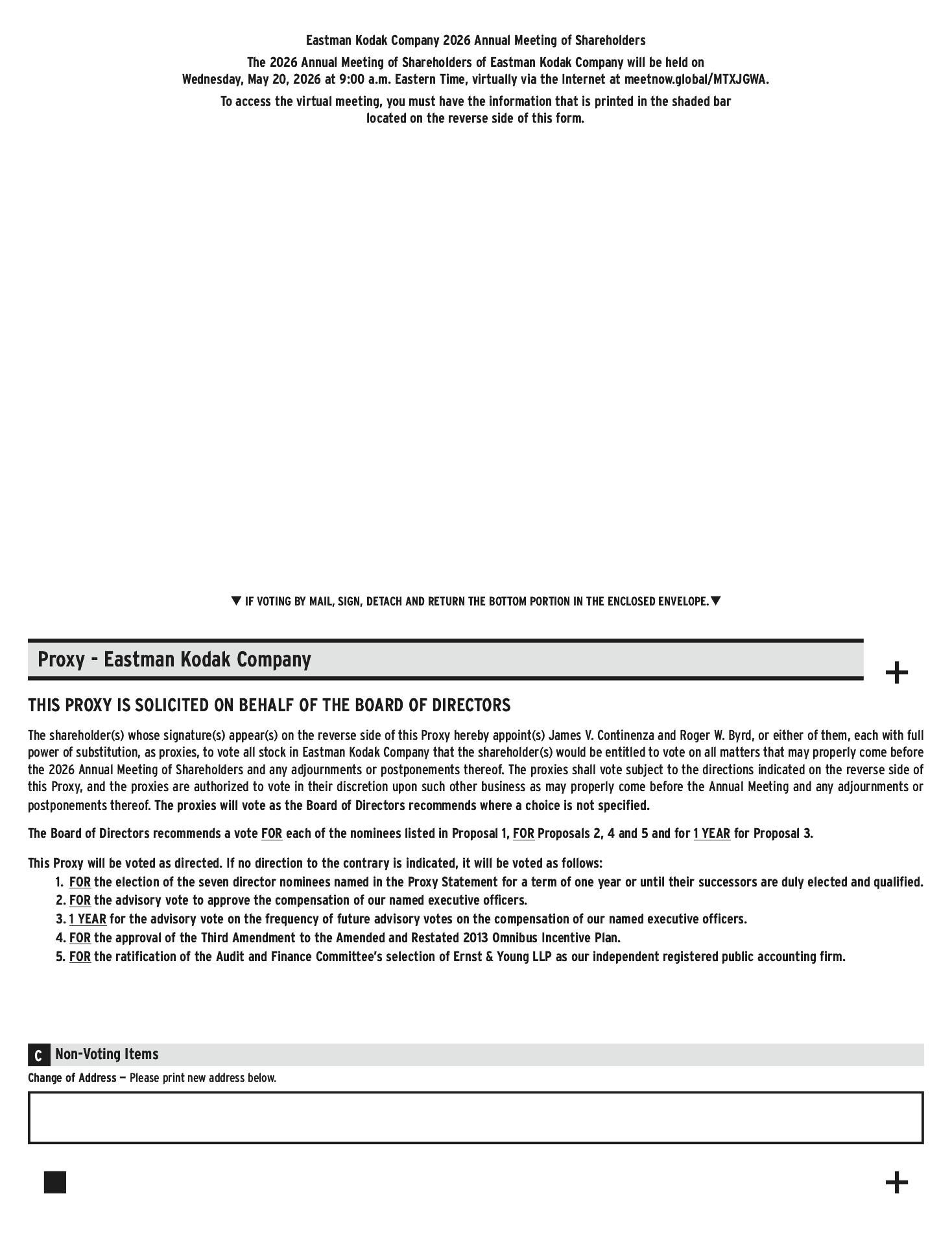 The 2026 Annual Meeting of Shareholders (Annual Meeting) of Eastman Kodak Company will be held on Wednesday, May 20, 2026 at 9:00 a.m. Eastern Time, virtually via a live webcast at meetnow.global/MTXJGWA. To attend the Annual Meeting, you will need your 15-digit control number included on your proxy card or Notice of Internet Availability of Proxy Materials. For additional information regarding procedures for attending the Annual Meeting, see “What do I need to do to participate in the Annual Meeting?” in the accompanying Proxy Statement. We are asking our shareholders to vote on the following proposals at the Annual Meeting:
