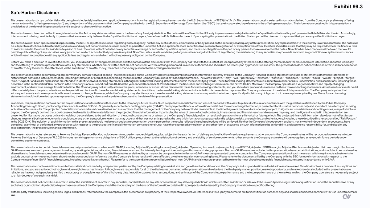 Exhibit 99.3 Safe Harbor Disclaimer This presentation is strictly confidential and is being furnished solely in reliance on applicable exemptions from the registration requirements under the U.S. Securities Act of 1933 (the “Act”). This presentation contains selected information derived from the Company's preliminary offering memorandum (the “offering memorandum”) and the portions of the documents that the Company has filed with the U.S. Securities and Exchange Commission (the “SEC”) that are incorporated by reference in the offering memorandum. The information contained in this presentation is provided as of the date of this presentation and is subject to change without notice. The notes have not been and will not be registered under the Act, or any state securities laws or the laws of any foreign jurisdiction. The notes will be offered in the U.S. only to persons reasonably believed to be “qualified institutional buyers” pursuant to Rule 144A under the Act. Accordingly, this document is being provided only to persons that are reasonably believed to be “qualified institutional buyers,” as defined in Rule 144A under the Act. By accepting this presentation in the United States, you will be deemed to represent that you are a qualified institutional buyer. The notes have not been approved or disapproved by the SEC, or any other securities regulating body or agency, nor has any such authority, commission, or body passed on the accuracy or adequacy of this presentation. Any representation to the contrary is a criminal offense. The notes will be subject to restrictions on transferability and resale and may not be transferred or resold except as permitted under the Act and applicable state securities laws pursuant to registration or exemption therefrom. Investors should be aware that they may be required to bear the financial risks of an investment in the notes for an indefinite period of time. The notes will not be listed on any securities exchange or automated quotation system, and there is no obligation on the part of any person to make a market for the notes. No action has been made or will be taken that would permit a public offering of any securities in any jurisdiction in which action for that purpose is required. No offers, sales, resales or delivery of any securities or any distribution of any offering material relating to any securities may be made in or from any jurisdiction except in circumstances which will result in compliance with any applicable laws and regulations and which will not impose any obligation on the Company. Before you make a decision to invest in the notes, you should read the offering memorandum and the portions of the documents that the Company has filed with the SEC that are incorporated by reference in the offering memorandum for more complete information about the Company and the offering to which this presentation relates. Any statements, whether oral or written, that are not consistent with the offering memorandum are not authorized and should not be relied upon by prospective investors. This presentation does not constitute an offer to sell or a solicitation of an offer to buy the notes. The offer to sell, or the solicitation of an offer to buy, the notes is made only pursuant to the offering memorandum. This presentation and the accompanying oral commentary contain “forward-looking” statements based on the Company’s beliefs and assumptions and on information currently available to the Company. Forward-looking statements include all statements other than statements of historical fact contained in this presentation, including information or predictions concerning the future of the Company’s business or financial performance. The words “believe,” “may,” “will,” “potentially,” “estimate,” “continue,” “anticipate,” “intend,” “could,” “would,” “project,” “target,” “plan,” “expect,” and similar expressions are intended to identify forward-looking statements, although not all forward-looking statements contain these identifying words. These forward-looking statements are subject to a number of risks, uncertainties, and assumptions, including those described in the section titled “Risk Factors” in the Company’s Annual Report on Form 10-K for the year ended December 31, 2025 filed with the Securities and Exchange Commission (the “2025 10-K”). Moreover, the Company operates in a very competitive and rapidly changing environment, and new risks emerge from time to time. The Company may not actually achieve the plans, intentions, or expectations disclosed in these forward-looking statements, and you should not place undue reliance on these forward-looking statements. Actual results or events could differ materially from the plans, intentions, and expectations disclosed in these forward-looking statements. In addition, the forward-looking statements included in this presentation represent the Company’s views as of the date of this presentation. The Company anticipates that subsequent events and developments will cause its views to change. However, while the Company may elect to update these forward-looking statements at some point in the future, it specifically disclaims any obligation to do so except as required by law. These forward-looking statements should not be relied upon as representing the Company’s views as of any date subsequent to the date of this presentation. In addition, this presentation contains certain projected financial information with respect to the Company's future results. Such projected financial information was not prepared with a view to public disclosure or compliance with the guidelines established by the Public Company Accounting Oversight Board, published guidance or rules of the SEC or U.S. generally accepted accounting principles ( GAAP ). Such projected financial information constitutes forward-looking information, is presented for illustrat