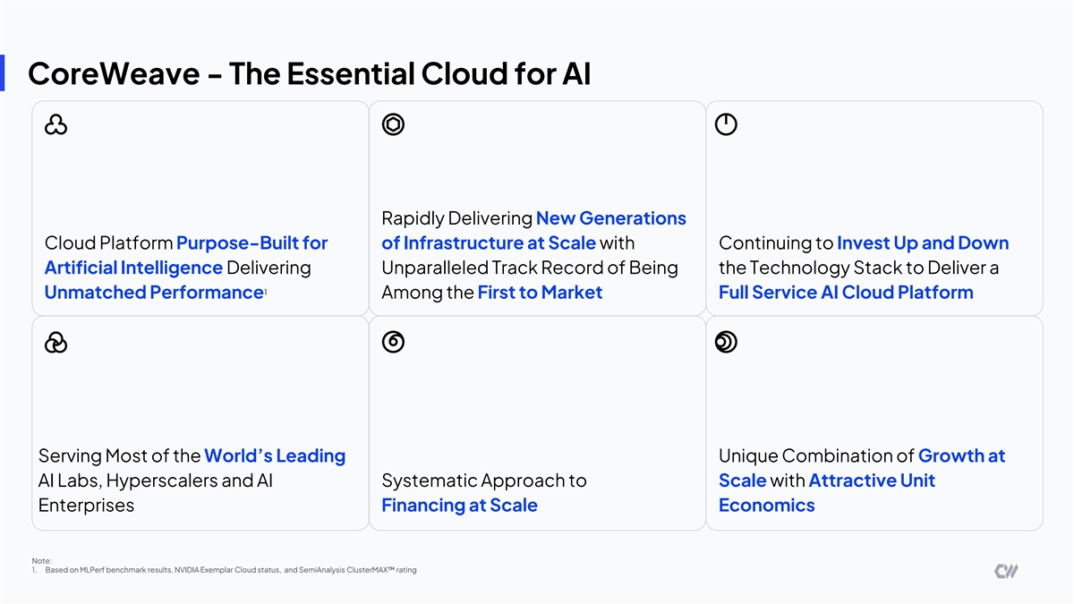 CoreWeave - The Essential Cloud for AI Rapidly Delivering New Generations Cloud Platform Purpose-Built for of Infrastructure at Scale with Continuing to Invest Up and Down Artificial Intelligence Delivering Unparalleled Track Record of Being the Technology Stack to Deliver a 1 Unmatched Performance Among the First to Market Full Service AI Cloud Platform Serving Most of the World’s Leading Unique Combination of Growth at AI Labs, Hyperscalers and AI Systematic Approach to Scale with Attractive Unit Enterprises Financing at Scale Economics Note: 1. Based on MLPerf benchmark results, NVIDIA Exemplar Cloud status, and SemiAnalysis ClusterMAX rating