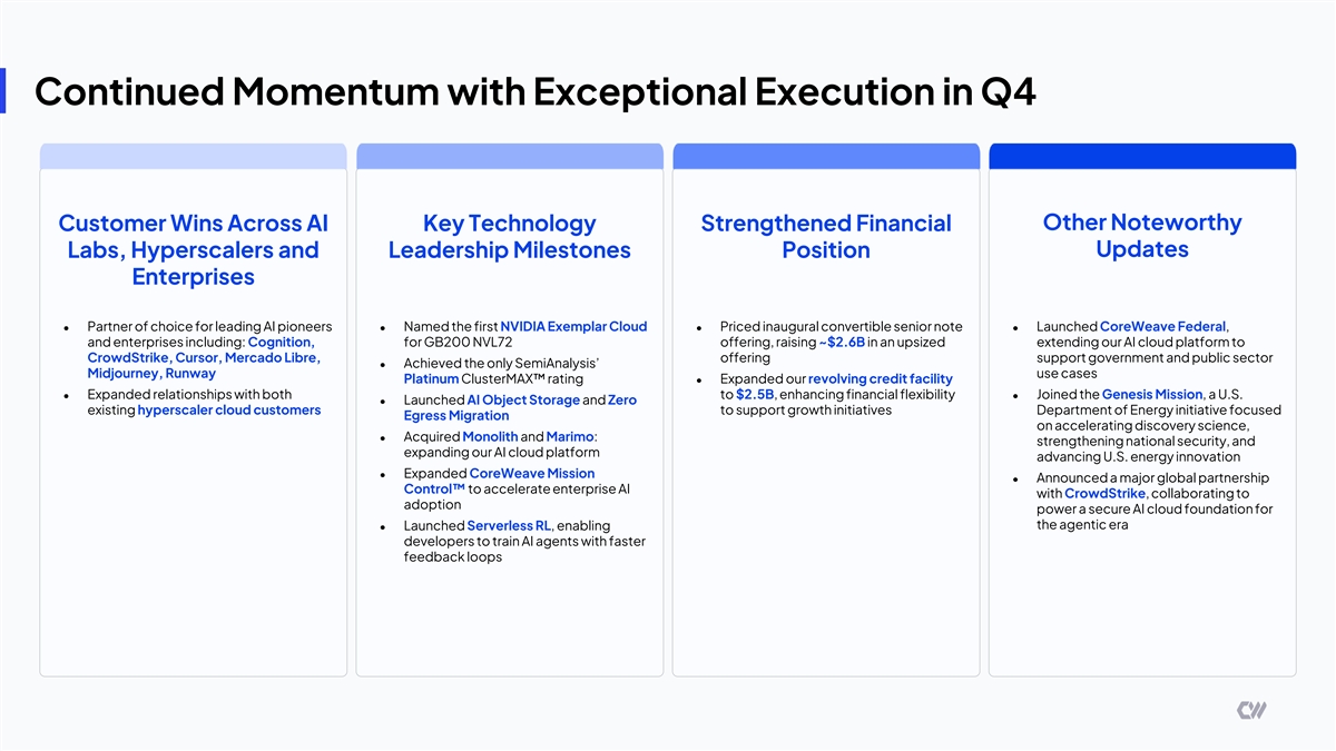 Continued Momentum with Exceptional Execution in Q4 Other Noteworthy Customer Wins Across AI Key Technology Strengthened Financial Updates Labs, Hyperscalers and Leadership Milestones Position Enterprises ● Partner of choice for leading AI pioneers● Named the first NVIDIA Exemplar Cloud● Priced inaugural convertible senior note● Launched CoreWeave Federal, and enterprises including: Cognition, for GB200 NVL72 offering, raising ~$2.6B in an upsized extending our AI cloud platform to CrowdStrike, Cursor, Mercado Libre, offering support government and public sector ● Achieved the only SemiAnalysis’ Midjourney, Runway use cases Platinum ClusterMAX rating● Expanded our revolving credit facility ● Expanded relationships with both to $2.5B, enhancing financial flexibility● Joined the Genesis Mission, a U.S. ● Launched AI Object Storage and Zero existing hyperscaler cloud customers to support growth initiatives Department of Energy initiative focused Egress Migration on accelerating discovery science, ● Acquired Monolith and Marimo: strengthening national security, and expanding our AI cloud platform advancing U.S. energy innovation ● Expanded CoreWeave Mission ● Announced a major global partnership Control to accelerate enterprise AI with CrowdStrike, collaborating to adoption power a secure AI cloud foundation for the agentic era ● Launched Serverless RL, enabling developers to train AI agents with faster feedback loops