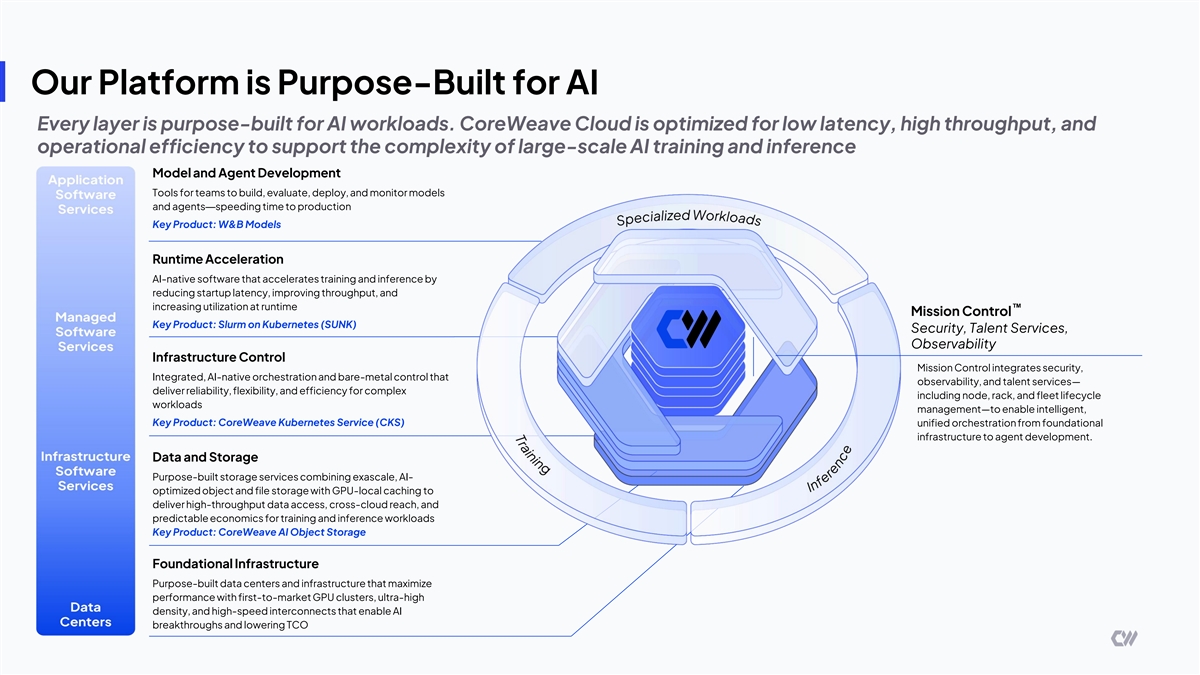 Our Platform is Purpose-Built for AI Every layer is purpose-built for AI workloads. CoreWeave Cloud is optimized for low latency, high throughput, and operational efficiency to support the complexity of large-scale AI training and inference Model and Agent Development Tools for teams to build, evaluate, deploy, and monitor models and agents—speeding time to production Key Product: W&B Models Runtime Acceleration AI-native software that accelerates training and inference by reducing startup latency, improving throughput, and increasing utilization at runtime Mission Control Key Product: Slurm on Kubernetes (SUNK) Security, Talent Services, Observability Infrastructure Control Mission Control integrates security, Integrated, AI-native orchestration and bare-metal control that observability, and talent services— deliver reliability, flexibility, and efficiency for complex including node, rack, and fleet lifecycle workloads management—to enable intelligent, Key Product: CoreWeave Kubernetes Service (CKS) unified orchestration from foundational infrastructure to agent development. Data and Storage Purpose-built storage services combining exascale, AI- optimized object and file storage with GPU-local caching to deliver high-throughput data access, cross-cloud reach, and predictable economics for training and inference workloads Key Product: CoreWeave AI Object Storage Foundational Infrastructure Purpose-built data centers and infrastructure that maximize performance with first-to-market GPU clusters, ultra-high density, and high-speed interconnects that enable AI breakthroughs and lowering TCO