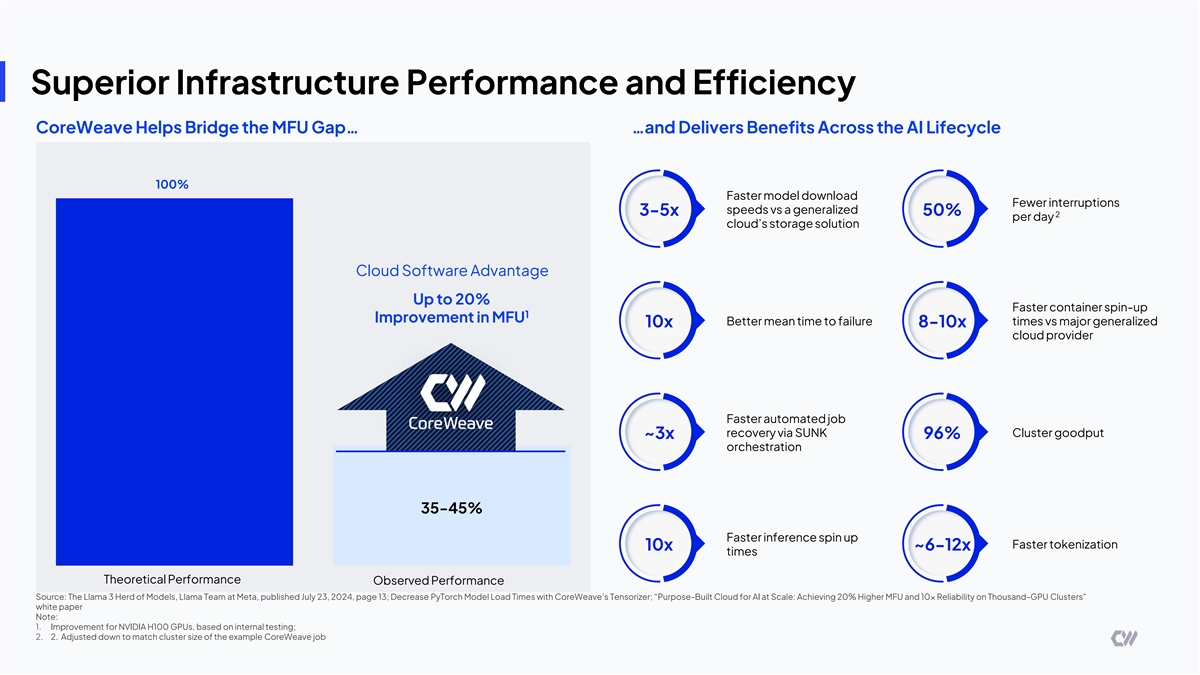 Superior Infrastructure Performance and Efficiency CoreWeave Helps Bridge the MFU Gap… …and Delivers Benefits Across the AI Lifecycle 100% Faster model download Fewer interruptions speeds vs a generalized 3-5x 50% 2 per day cloud’s storage solution Cloud Software Advantage Up to 20% Faster container spin-up 1 Improvement in MFU Better mean time to failure times vs major generalized 10x 8-10x cloud provider Faster automated job recovery via SUNK Cluster goodput ~3x 96% orchestration 35-45% Faster inference spin up Faster tokenization 10x ~6-12x times Theoretical Performance Observed Performance Source: The Llama 3 Herd of Models, Llama Team at Meta, published July 23, 2024, page 13; Decrease PyTorch Model Load Times with CoreWeave’s Tensorizer; “Purpose-Built Cloud for AI at Scale: Achieving 20% Higher MFU and 10× Reliability on Thousand-GPU Clusters” white paper Note: 1. Improvement for NVIDIA H100 GPUs, based on internal testing; 2. 2. Adjusted down to match cluster size of the example CoreWeave job