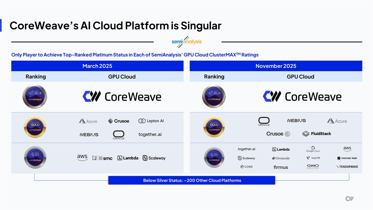 CoreWeave’s AI Cloud Platform is Singular TM Only Player to Achieve Top-Ranked Platinum Status in Each of SemiAnalysis’ GPU Cloud ClusterMAX Ratings March 2025 November 2025 Ranking GPU Cloud Ranking GPU Cloud Below Silver Status: ~200 Other Cloud Platforms