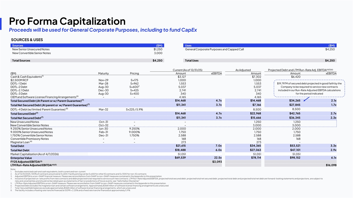 Pro Forma Capitalization Proceeds will be used for General Corporate Purposes, including to fund CapEx SOURCES & USES Sources ($M) Uses ($M) New Senior Unsecured Notes $1,250 General Corporate Purposes and Capped Call $4,250 New Convertible Senior Notes 3,000 Total Sources $4,250 Total Uses $4,250 (4)(5)(6) Current (As of 12/31/25) As Adjusted Projected Debt and LTM Run-Rate Adj. EBITDA ($M) Maturity Pricing Amount xEBITDA Amount Amount xEBITDA (1) Cash & Cash Equivalents $3,127 $7,302 $6,420 $2,500M RCF Nov-29 S+175 1,000 1,000 $19,797M of secured debt projected in good faith by the DDTL-1 Debt Mar-28 S+962 1,553 1,553 2 DDTL-2 Debt Aug-30 S+600 5,037 5,037 Company to be required to service new contracts DDTL-2.1 Debt Dec-30 S+425 2,741 2,741 included in our Run-Rate Adjusted EBITDA calculations DDTL-3 Debt Aug-30 S+400 340 340 for the period indicated (6) OEM and Software License Financing Arrangements - - 4,165 4,165 (7) $14,468 4.7x $14,468 $34,265 2.1x Total Secured Debt (At Parent or w/ Parent Guarantee) (7) $11,341 3.7x $7,166 $27,845 1.7x Total Net Secured Debt (At parent or w/ Parent Guarantee) (8) 8,500 DDTL-4 Debt (w/ limited Parent Guarantee) Mar-32 S+225 / 5.9% - 8,500 (7) $14,468 4.7x $22,968 $42,765 2.7x Total Secured Debt (7) $11,341 3.7x $15,666 $36,345 2.3x Total Net Secured Debt New Unsecured Notes Oct-31 - - 1,250 1,250 New Convertible Senior Notes Oct-32 - - 3,000 3,000 9.250% Senior Unsecured Notes Jun-30 9.250% 2,000 2,000 2,000 9.000% Senior Unsecured Notes Feb-31 9.000% 1,750 1,750 1,750 1.750% Convertible Senior Notes Dec-31 1.750% 2,588 2,588 2,588 Convertible Promissory Notes - - 168 168 168 (6) Magnetar Loan - - 273 273 - $21,615 7.0x $34,365 $53,521 3.3x Total Debt $18,488 6.0x $27,063 $47,101 2.9x Total Net Debt Market Capitalization (As of 4/7/2026) 51,051 51,051 51,051 $69,539 22.5x $78,114 $98,152 6.1x Enterprise Value (3) FY25 Adjusted EBITDA $3,093 (4)(5) LTM Run-Rate Adjusted EBITDA $16,098 Note: 1. Excludes restricted cash and cash equivalents, both current and non-current 2. As of 12/31/2025, 100% of contracts are priced at S+600; Facility pricing can be S+650 for other IG contracts and S+1300 for non-IG contracts 3. Adjusted EBITDA is a non-GAAP financial measure. Please see reconciliations from GAAP to non-GAAP measures contained in the Appendix to this presentation 4. Inclusive of projected run-rate profits from new contracts and debt projected to be required to service such new contracts. LTM Run-Rate Adjusted EBITDA, projected total secured debt, projected total net secured debt, projected total debt and projected total net debt are forward-looking statements and projections, are subject to risks and uncertainties and should not be relied upon as statements of fact or predictions of future events; see Safe Harbor Disclaimer 5. LTM Run-Rate Adjusted EBITDA is a non-GAAP measure. Please see reconciliation from GAAP to non-GAAP measures contained in the Appendix to this presentation. 6. Projected Debt excludes the magnetar loan and certain software arrangements. Approximately $368 million of software license financing arrangements are unsecured 7. Total Secured Debt balances exclude approximately $368 million of software license financing arrangements, which are unsecured 8. The facility includes a floating rate tranche financed at SOFR + 2.25% and a fixed rate tranche financed at approximately 5.9%