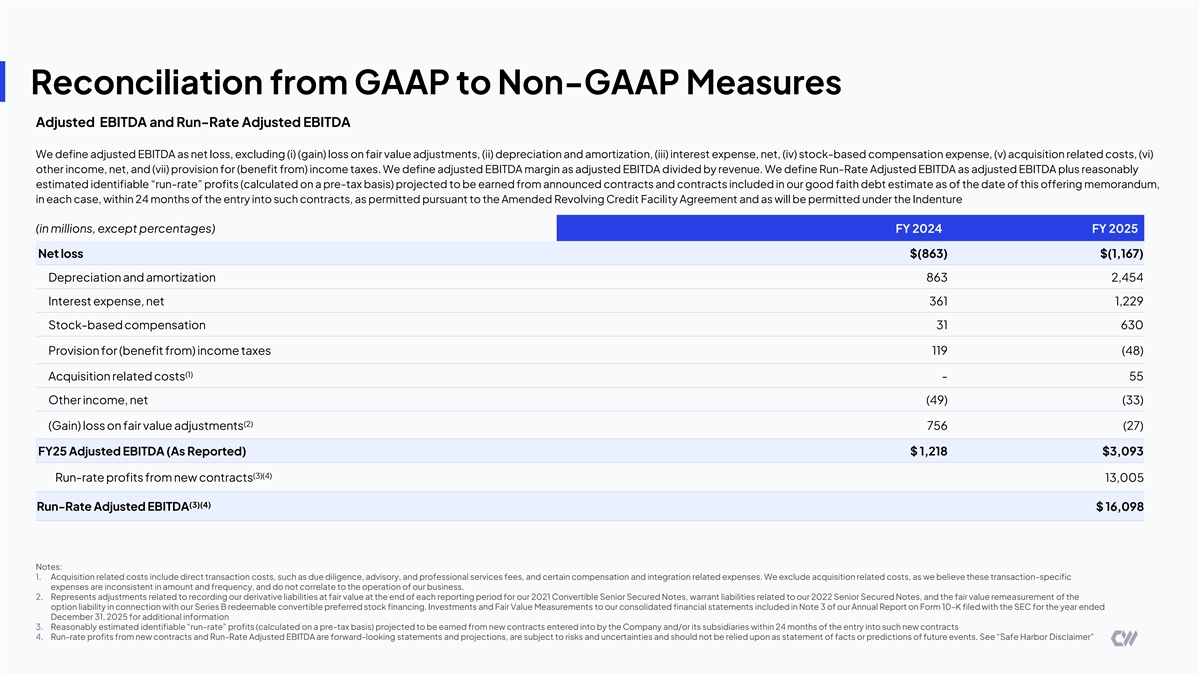 Reconciliation from GAAP to Non-GAAP Measures Adjusted EBITDA and Run-Rate Adjusted EBITDA We define adjusted EBITDA as net loss, excluding (i) (gain) loss on fair value adjustments, (ii) depreciation and amortization, (iii) interest expense, net, (iv) stock-based compensation expense, (v) acquisition related costs, (vi) other income, net, and (vii) provision for (benefit from) income taxes. We define adjusted EBITDA margin as adjusted EBITDA divided by revenue. We define Run-Rate Adjusted EBITDA as adjusted EBITDA plus reasonably estimated identifiable “run-rate” profits (calculated on a pre-tax basis) projected to be earned from announced contracts and contracts included in our good faith debt estimate as of the date of this offering memorandum, in each case, within 24 months of the entry into such contracts, as permitted pursuant to the Amended Revolving Credit Facility Agreement and as will be permitted under the Indenture (in millions, except percentages) FY 2024 FY 2025 Net loss $(863) $(1,167) Depreciation and amortization 863 2,454 Interest expense, net 361 1,229 Stock-based compensation 31 630 Provision for (benefit from) income taxes 119 (48) (1) Acquisition related costs - 55 Other income, net (49) (33) (2) (Gain) loss on fair value adjustments 756 (27) FY25 Adjusted EBITDA (As Reported) $ 1,218 $3,093 (3)(4) Run-rate profits from new contracts 13,005 (3)(4) Run-Rate Adjusted EBITDA $ 16,098 Notes: 1. Acquisition related costs include direct transaction costs, such as due diligence, advisory, and professional services fees, and certain compensation and integration related expenses. We exclude acquisition related costs, as we believe these transaction-specific expenses are inconsistent in amount and frequency, and do not correlate to the operation of our business. 2. Represents adjustments related to recording our derivative liabilities at fair value at the end of each reporting period for our 2021 Convertible Senior Secured Notes, warrant liabilities related to our 2022 Senior Secured Notes, and the fair value remeasurement of the option liability in connection with our Series B redeemable convertible preferred stock financing. Investments and Fair Value Measurements to our consolidated financial statements included in Note 3 of our Annual Report on Form 10-K filed with the SEC for the year ended December 31, 2025 for additional information 3. Reasonably estimated identifiable “run-rate” profits (calculated on a pre-tax basis) projected to be earned from new contracts entered into by the Company and/or its subsidiaries within 24 months of the entry into such new contracts 4. Run-rate profits from new contracts and Run-Rate Adjusted EBITDA are forward-looking statements and projections, are subject to risks and uncertainties and should not be relied upon as statement of facts or predictions of future events. See “Safe Harbor Disclaimer”