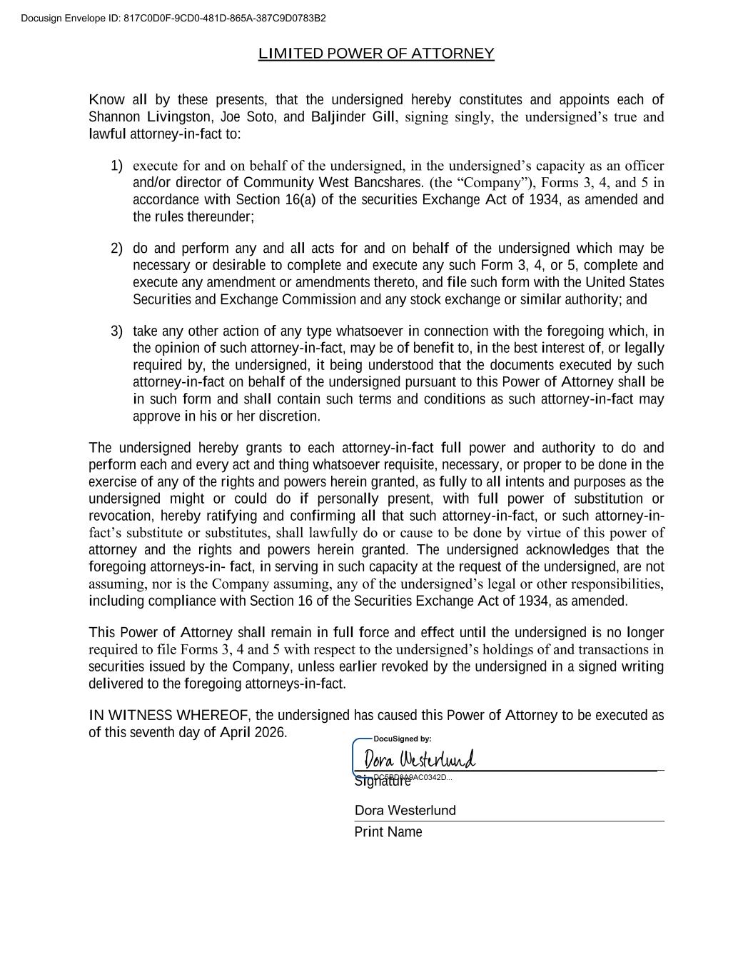 LIMITED POWER OF ATTORNEY Know all by these presents, that the undersigned hereby constitutes and appoints each of Shannon Livingston, Joe Soto, and Baljinder Gill, signing singly, the undersigned’s true and lawful attorney-in-fact to: 1) execute for and on behalf of the undersigned, in the undersigned’s capacity as an officer and/or director of Community West Bancshares. (the “Company”), Forms 3, 4, and 5 in accordance with Section 16(a) of the securities Exchange Act of 1934, as amended and the rules thereunder; 2) do and perform any and all acts for and on behalf of the undersigned which may be necessary or desirable to complete and execute any such Form 3, 4, or 5, complete and execute any amendment or amendments thereto, and file such form with the United States Securities and Exchange Commission and any stock exchange or similar authority; and 3) take any other action of any type whatsoever in connection with the foregoing which, in the opinion of such attorney-in-fact, may be of benefit to, in the best interest of, or legally required by, the undersigned, it being understood that the documents executed by such attorney-in-fact on behalf of the undersigned pursuant to this Power of Attorney shall be in such form and shall contain such terms and conditions as such attorney-in-fact may approve in his or her discretion. The undersigned hereby grants to each attorney-in-fact full power and authority to do and perform each and every act and thing whatsoever requisite, necessary, or proper to be done in the exercise of any of the rights and powers herein granted, as fully to all intents and purposes as the undersigned might or could do if personally present, with full power of substitution or revocation, hereby ratifying and confirming all that such attorney-in-fact, or such attorney-in- fact’s substitute or substitutes, shall lawfully do or cause to be done by virtue of this power of attorney and the rights and powers herein granted. The undersigned acknowledges that the foregoing attorneys-in- fact, in serving in such capacity at the request of the undersigned, are not assuming, nor is the Company assuming, any of the undersigned’s legal or other responsibilities, including compliance with Section 16 of the Securities Exchange Act of 1934, as amended. This Power of Attorney shall remain in full force and effect until the undersigned is no longer required to file Forms 3, 4 and 5 with respect to the undersigned’s holdings of and transactions in securities issued by the Company, unless earlier revoked by the undersigned in a signed writing delivered to the foregoing attorneys-in-fact. IN WITNESS WHEREOF, the undersigned has caused this Power of Attorney to be executed as of this seventh day of April 2026. _________________________________________ Signature Print Name Docusign Envelope ID: 817C0D0F-9CD0-481D-865A-387C9D0783B2 Dora Westerlund