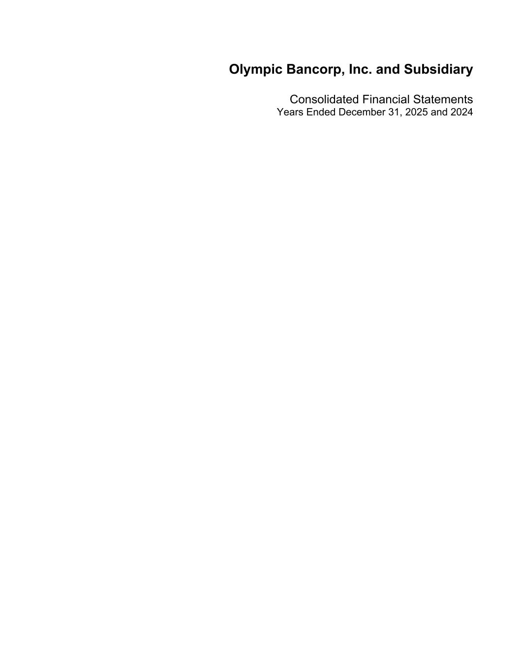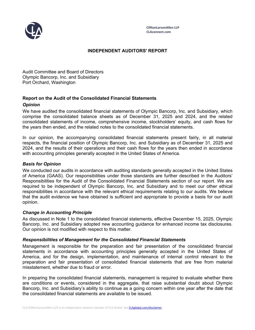 CLA (CliftonLarsonAllen LLP) is an independent network member of CLA Global. See CLAglobal.com/disclaimer. CliftonLarsonAllen LLP CLAconnect.com INDEPENDENT AUDITORS' REPORT Audit Committee and Board of Directors Olympic Bancorp, Inc. and Subsidiary Port Orchard, Washington Report on the Audit of the Consolidated Financial Statements Opinion We have audited the consolidated financial statements of Olympic Bancorp, Inc. and Subsidiary, which comprise the consolidated balance sheets as of December 31, 2025 and 2024, and the related consolidated statements of income, comprehensive income, stockholders’ equity, and cash flows for the years then ended, and the related notes to the consolidated financial statements. In our opinion, the accompanying consolidated financial statements present fairly, in all material respects, the financial position of Olympic Bancorp, Inc. and Subsidiary as of December 31, 2025 and 2024, and the results of their operations and their cash flows for the years then ended in accordance with accounting principles generally accepted in the United States of America. Basis for Opinion We conducted our audits in accordance with auditing standards generally accepted in the United States of America (GAAS). Our responsibilities under those standards are further described in the Auditors’ Responsibilities for the Audit of the Consolidated Financial Statements section of our report. We are required to be independent of Olympic Bancorp, Inc. and Subsidiary and to meet our other ethical responsibilities in accordance with the relevant ethical requirements relating to our audits. We believe that the audit evidence we have obtained is sufficient and appropriate to provide a basis for our audit opinion. Change in Accounting Principle As discussed in Note 1 to the consolidated financial statements, effective December 15, 2025, Olympic Bancorp, Inc. and Subsidiary adopted new accounting guidance for enhanced income tax disclosures. Our opinion is not modified with respect to this matter. Responsibilities of Management for the Consolidated Financial Statements Management is responsible for the preparation and fair presentation of the consolidated financial statements in accordance with accounting principles generally accepted in the United States of America, and for the design, implementation, and maintenance of internal control relevant to the preparation and fair presentation of consolidated financial statements that are free from material misstatement, whether due to fraud or error. In preparing the consolidated financial statements, management is required to evaluate whether there are conditions or events, considered in the aggregate, that raise substantial doubt about Olympic Bancorp, Inc. and Subsidiary’s ability to continue as a going concern within one year after the date that the consolidated financial statements are available to be issued.