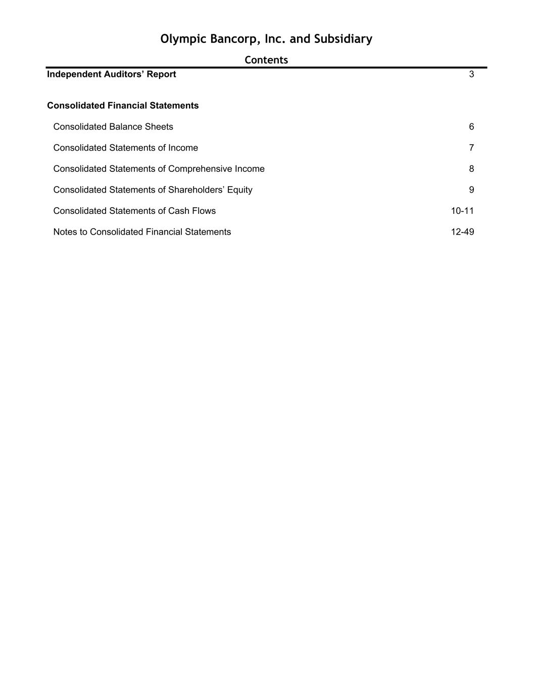 Olympic Bancorp, Inc. and Subsidiary Contents Independent Auditors’ Report 3 Consolidated Financial Statements Consolidated Balance Sheets 6 Consolidated Statements of Income 7 Consolidated Statements of Comprehensive Income 8 Consolidated Statements of Shareholders’ Equity 9 Consolidated Statements of Cash Flows 10-11 Notes to Consolidated Financial Statements 12-49