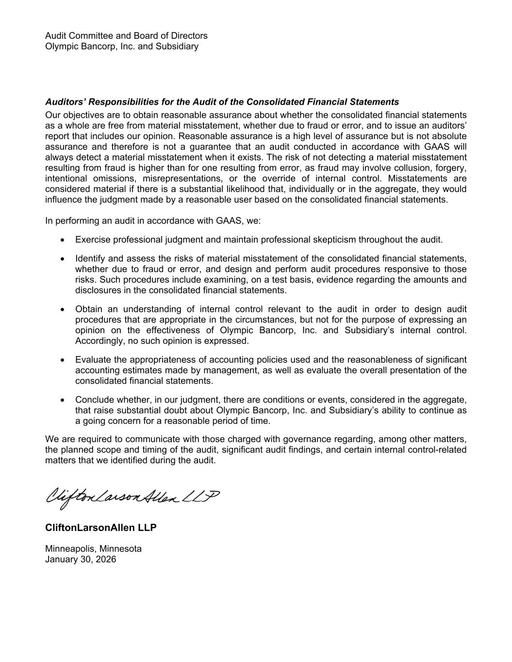Audit Committee and Board of Directors Olympic Bancorp, Inc. and Subsidiary Auditors’ Responsibilities for the Audit of the Consolidated Financial Statements Our objectives are to obtain reasonable assurance about whether the consolidated financial statements as a whole are free from material misstatement, whether due to fraud or error, and to issue an auditors’ report that includes our opinion. Reasonable assurance is a high level of assurance but is not absolute assurance and therefore is not a guarantee that an audit conducted in accordance with GAAS will always detect a material misstatement when it exists. The risk of not detecting a material misstatement resulting from fraud is higher than for one resulting from error, as fraud may involve collusion, forgery, intentional omissions, misrepresentations, or the override of internal control. Misstatements are considered material if there is a substantial likelihood that, individually or in the aggregate, they would influence the judgment made by a reasonable user based on the consolidated financial statements. In performing an audit in accordance with GAAS, we: Exercise professional judgment and maintain professional skepticism throughout the audit. Identify and assess the risks of material misstatement of the consolidated financial statements, whether due to fraud or error, and design and perform audit procedures responsive to those risks. Such procedures include examining, on a test basis, evidence regarding the amounts and disclosures in the consolidated financial statements. Obtain an understanding of internal control relevant to the audit in order to design audit procedures that are appropriate in the circumstances, but not for the purpose of expressing an opinion on the effectiveness of Olympic Bancorp, Inc. and Subsidiary’s internal control. Accordingly, no such opinion is expressed. Evaluate the appropriateness of accounting policies used and the reasonableness of significant accounting estimates made by management, as well as evaluate the overall presentation of the consolidated financial statements. Conclude whether, in our judgment, there are conditions or events, considered in the aggregate, that raise substantial doubt about Olympic Bancorp, Inc. and Subsidiary’s ability to continue as a going concern for a reasonable period of time. We are required to communicate with those charged with governance regarding, among other matters, the planned scope and timing of the audit, significant audit findings, and certain internal control-related matters that we identified during the audit. CliftonLarsonAllen LLP Minneapolis, Minnesota January 30, 2026