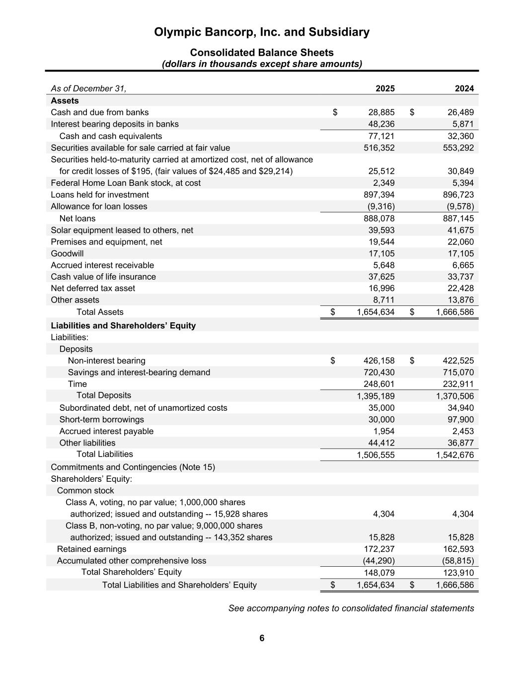Olympic Bancorp, Inc. and Subsidiary Consolidated Balance Sheets (dollars in thousands except share amounts) 6 As of December 31, 2025 2024 Assets Cash and due from banks $ 28,885 $ 26,489 Interest bearing deposits in banks 48,236 5,871 Cash and cash equivalents 77,121 32,360 Securities available for sale carried at fair value 516,352 553,292 Securities held-to-maturity carried at amortized cost, net of allowance for credit losses of $195, (fair values of $24,485 and $29,214) 25,512 30,849 Federal Home Loan Bank stock, at cost 2,349 5,394 Loans held for investment 897,394 896,723 Allowance for loan losses (9,316) (9,578) Net loans 888,078 887,145 Solar equipment leased to others, net 39,593 41,675 Premises and equipment, net 19,544 22,060 Goodwill 17,105 17,105 Accrued interest receivable 5,648 6,665 Cash value of life insurance 37,625 33,737 Net deferred tax asset 16,996 22,428 Other assets 8,711 13,876 Total Assets $ 1,654,634 $ 1,666,586 Liabilities and Shareholders’ Equity Liabilities: Deposits Non-interest bearing $ 426,158 $ 422,525 Savings and interest-bearing demand 720,430 715,070 Time 248,601 232,911 Total Deposits 1,395,189 1,370,506 Subordinated debt, net of unamortized costs 35,000 34,940 Short-term borrowings 30,000 97,900 Accrued interest payable 1,954 2,453 Other liabilities 44,412 36,877 Total Liabilities 1,506,555 1,542,676 Commitments and Contingencies (Note 15) Shareholders’ Equity: Common stock Class A, voting, no par value; 1,000,000 shares authorized; issued and outstanding -- 15,928 shares 4,304 4,304 Class B, non-voting, no par value; 9,000,000 shares authorized; issued and outstanding -- 143,352 shares 15,828 15,828 Retained earnings 172,237 162,593 Accumulated other comprehensive loss (44,290) (58,815) Total Shareholders’ Equity 148,079 123,910 Total Liabilities and Shareholders’ Equity $ 1,654,634 $ 1,666,586 See accompanying notes to consolidated financial statements