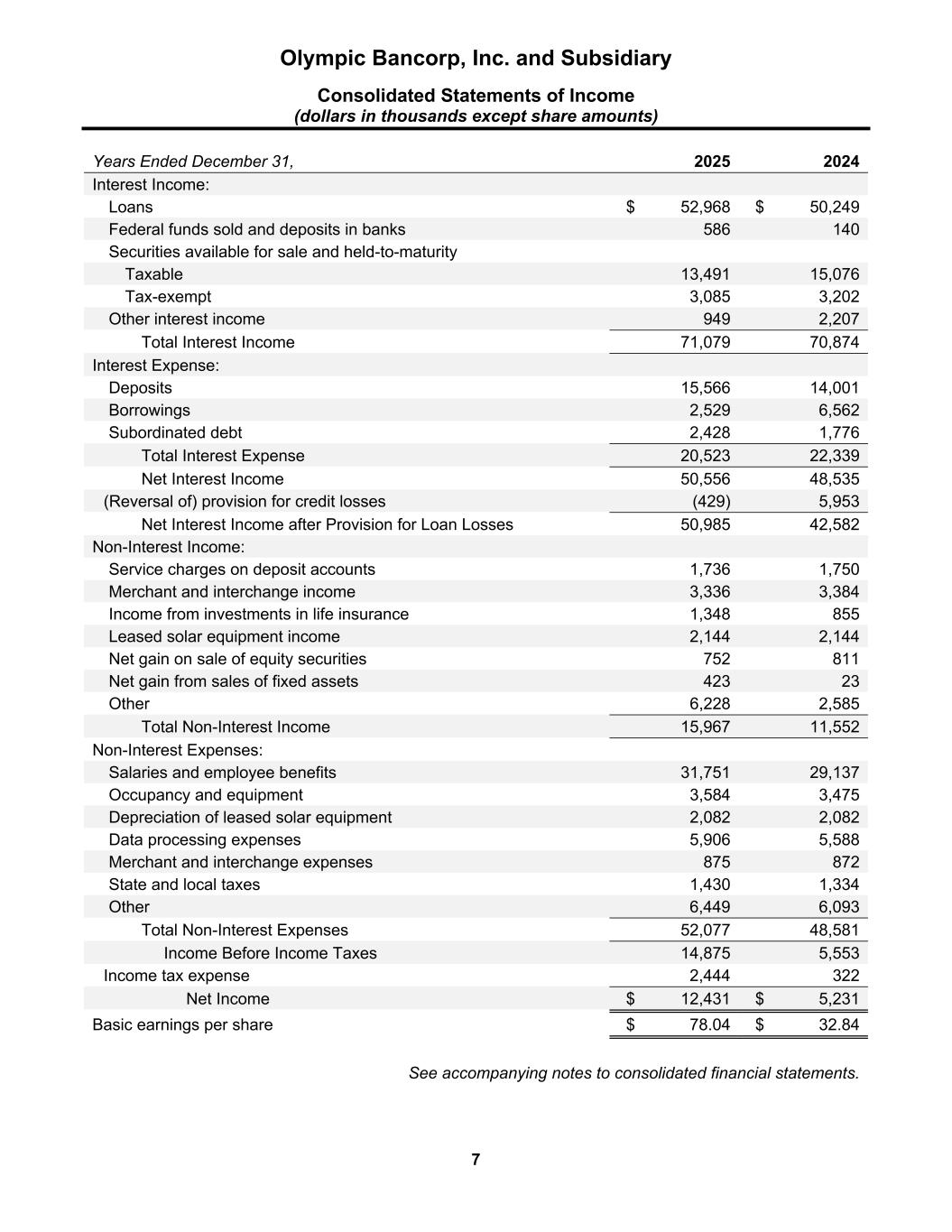 Olympic Bancorp, Inc. and Subsidiary Consolidated Statements of Income (dollars in thousands except share amounts) 7 Years Ended December 31, 2025 2024 Interest Income: Loans $ 52,968 $ 50,249 Federal funds sold and deposits in banks 586 140 Securities available for sale and held-to-maturity Taxable 13,491 15,076 Tax-exempt 3,085 3,202 Other interest income 949 2,207 Total Interest Income 71,079 70,874 Interest Expense: Deposits 15,566 14,001 Borrowings 2,529 6,562 Subordinated debt 2,428 1,776 Total Interest Expense 20,523 22,339 Net Interest Income 50,556 48,535 (Reversal of) provision for credit losses (429) 5,953 Net Interest Income after Provision for Loan Losses 50,985 42,582 Non-Interest Income: Service charges on deposit accounts 1,736 1,750 Merchant and interchange income 3,336 3,384 Income from investments in life insurance 1,348 855 Leased solar equipment income 2,144 2,144 Net gain on sale of equity securities 752 811 Net gain from sales of fixed assets 423 23 Other 6,228 2,585 Total Non-Interest Income 15,967 11,552 Non-Interest Expenses: Salaries and employee benefits 31,751 29,137 Occupancy and equipment 3,584 3,475 Depreciation of leased solar equipment 2,082 2,082 Data processing expenses 5,906 5,588 Merchant and interchange expenses 875 872 State and local taxes 1,430 1,334 Other 6,449 6,093 Total Non-Interest Expenses 52,077 48,581 Income Before Income Taxes 14,875 5,553 Income tax expense 2,444 322 Net Income $ 12,431 $ 5,231 Basic earnings per share $ 78.04 $ 32.84 See accompanying notes to consolidated financial statements.