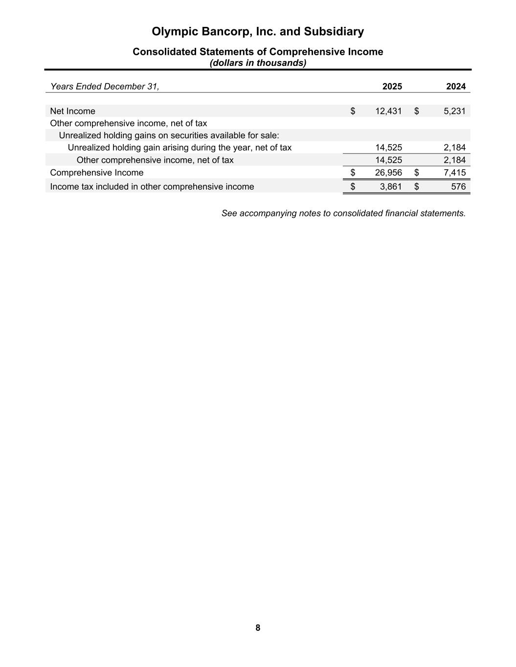 Olympic Bancorp, Inc. and Subsidiary Consolidated Statements of Comprehensive Income (dollars in thousands) 8 Years Ended December 31, 2025 2024 Net Income $ 12,431 $ 5,231 Other comprehensive income, net of tax Unrealized holding gains on securities available for sale: Unrealized holding gain arising during the year, net of tax 14,525 2,184 Other comprehensive income, net of tax 14,525 2,184 Comprehensive Income $ 26,956 $ 7,415 Income tax included in other comprehensive income $ 3,861 $ 576 See accompanying notes to consolidated financial statements.