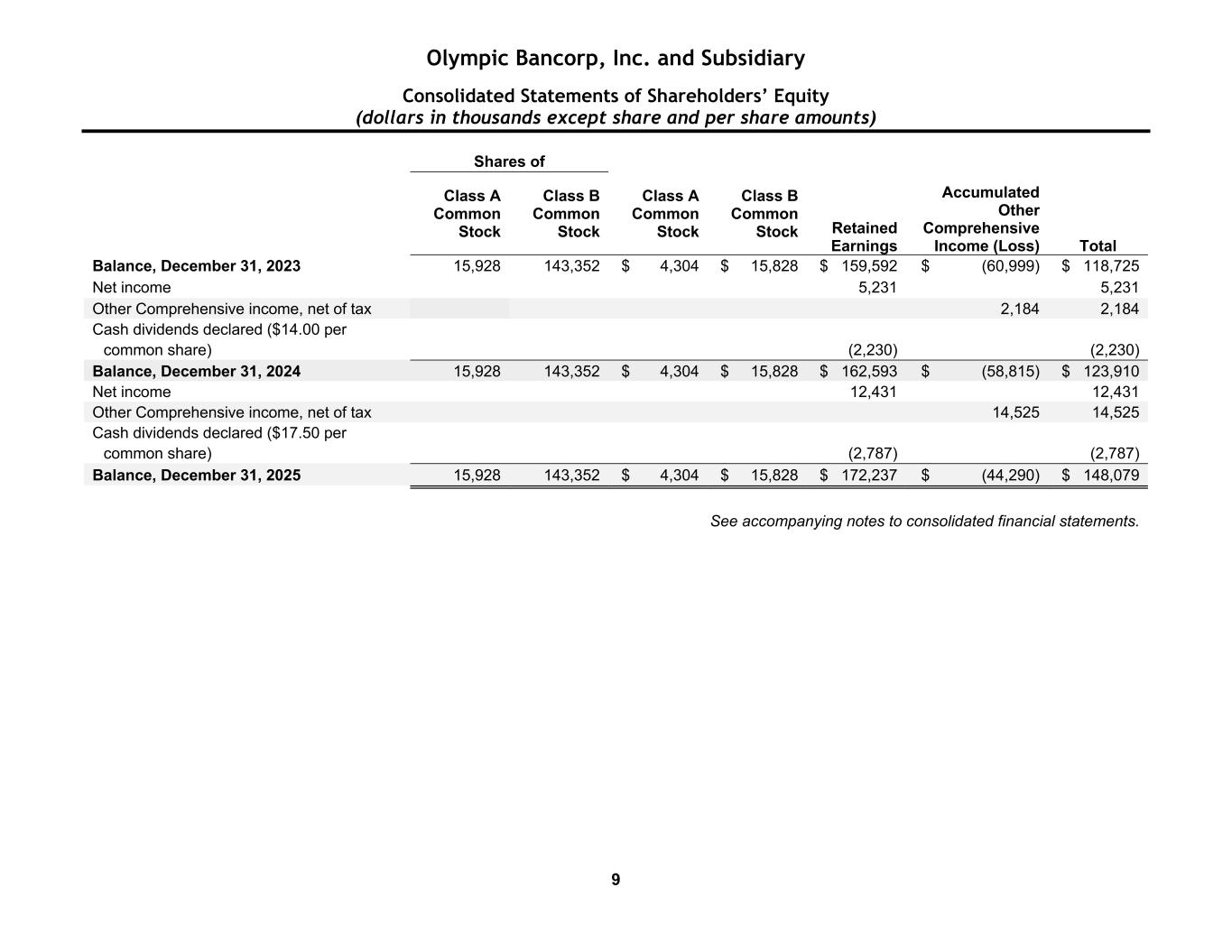 Olympic Bancorp, Inc. and Subsidiary Consolidated Statements of Shareholders’ Equity (dollars in thousands except share and per share amounts) 9 Shares of Class A Common Stock Class B Common Stock Class A Common Stock Class B Common Stock Retained Earnings Accumulated Other Comprehensive Income (Loss) Total Balance, December 31, 2023 15,928 143,352 $ 4,304 $ 15,828 $ 159,592 $ (60,999) $ 118,725 Net income 5,231 5,231 Other Comprehensive income, net of tax 2,184 2,184 Cash dividends declared ($14.00 per common share) (2,230) (2,230) Balance, December 31, 2024 15,928 143,352 $ 4,304 $ 15,828 $ 162,593 $ (58,815) $ 123,910 Net income 12,431 12,431 Other Comprehensive income, net of tax 14,525 14,525 Cash dividends declared ($17.50 per common share) (2,787) (2,787) Balance, December 31, 2025 15,928 143,352 $ 4,304 $ 15,828 $ 172,237 $ (44,290) $ 148,079 See accompanying notes to consolidated financial statements.