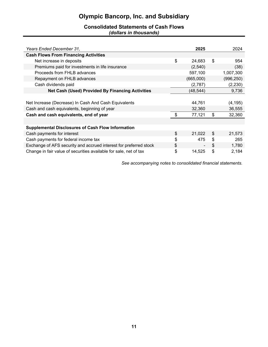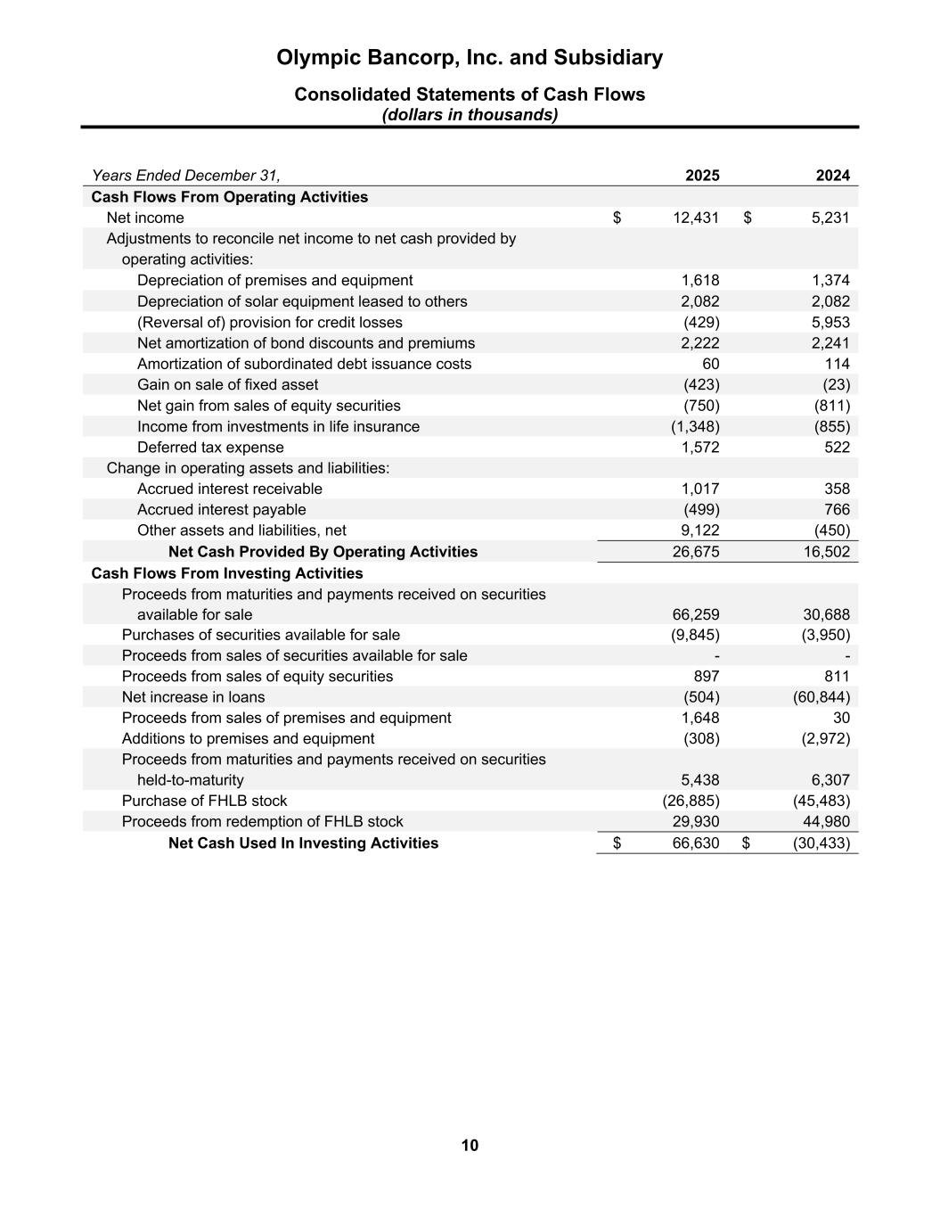 Olympic Bancorp, Inc. and Subsidiary Consolidated Statements of Cash Flows (dollars in thousands) 10 Years Ended December 31, 2025 2024 Cash Flows From Operating Activities Net income $ 12,431 $ 5,231 Adjustments to reconcile net income to net cash provided by operating activities: Depreciation of premises and equipment 1,618 1,374 Depreciation of solar equipment leased to others 2,082 2,082 (Reversal of) provision for credit losses (429) 5,953 Net amortization of bond discounts and premiums 2,222 2,241 Amortization of subordinated debt issuance costs 60 114 Gain on sale of fixed asset (423) (23) Net gain from sales of equity securities (750) (811) Income from investments in life insurance (1,348) (855) Deferred tax expense 1,572 522 Change in operating assets and liabilities: Accrued interest receivable 1,017 358 Accrued interest payable (499) 766 Other assets and liabilities, net 9,122 (450) Net Cash Provided By Operating Activities 26,675 16,502 Cash Flows From Investing Activities Proceeds from maturities and payments received on securities available for sale 66,259 30,688 Purchases of securities available for sale (9,845) (3,950) Proceeds from sales of securities available for sale - - Proceeds from sales of equity securities 897 811 Net increase in loans (504) (60,844) Proceeds from sales of premises and equipment 1,648 30 Additions to premises and equipment (308) (2,972) Proceeds from maturities and payments received on securities held-to-maturity 5,438 6,307 Purchase of FHLB stock (26,885) (45,483) Proceeds from redemption of FHLB stock 29,930 44,980 Net Cash Used In Investing Activities $ 66,630 $ (30,433)