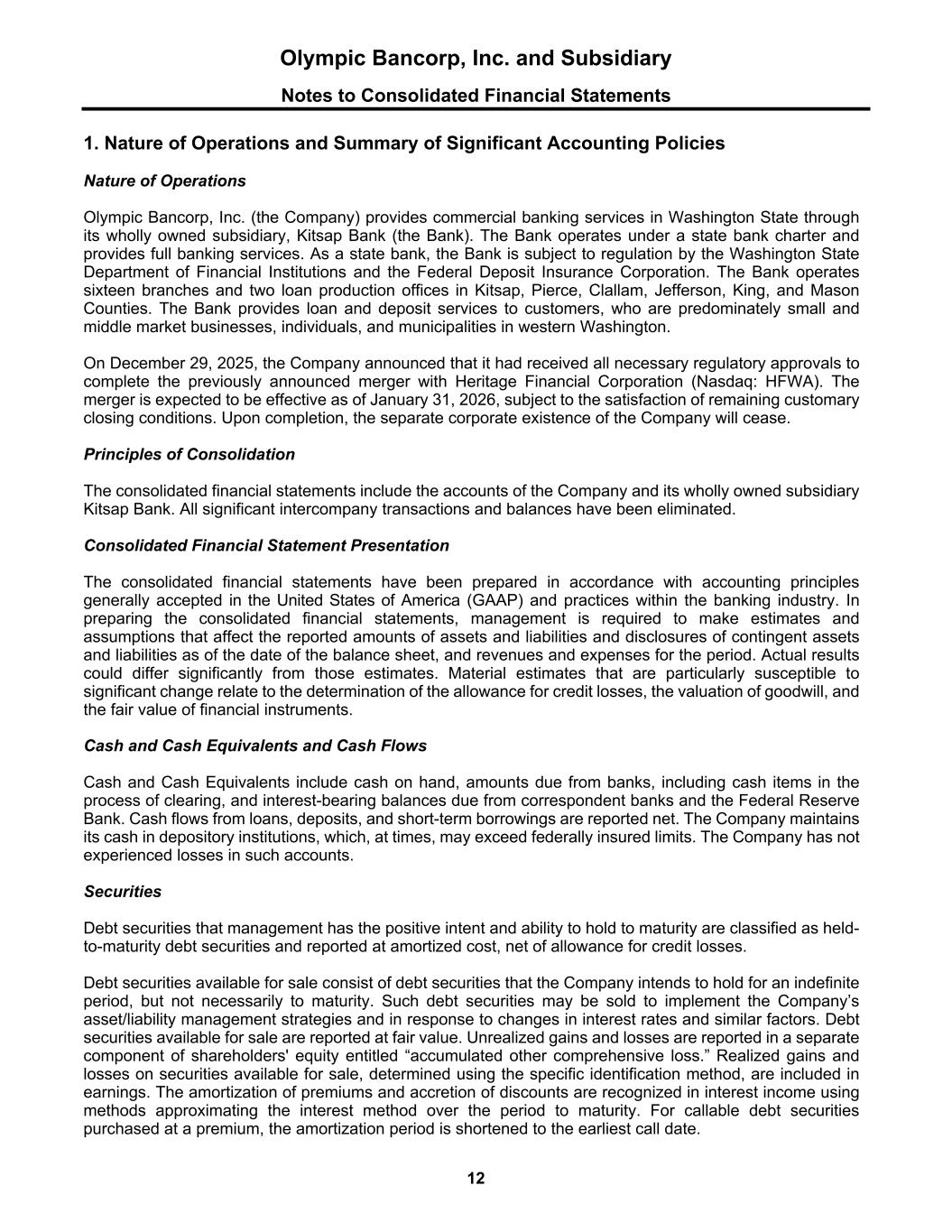 Olympic Bancorp, Inc. and Subsidiary Notes to Consolidated Financial Statements 12 1. Nature of Operations and Summary of Significant Accounting Policies Nature of Operations Olympic Bancorp, Inc. (the Company) provides commercial banking services in Washington State through its wholly owned subsidiary, Kitsap Bank (the Bank). The Bank operates under a state bank charter and provides full banking services. As a state bank, the Bank is subject to regulation by the Washington State Department of Financial Institutions and the Federal Deposit Insurance Corporation. The Bank operates sixteen branches and two loan production offices in Kitsap, Pierce, Clallam, Jefferson, King, and Mason Counties. The Bank provides loan and deposit services to customers, who are predominately small and middle market businesses, individuals, and municipalities in western Washington. On December 29, 2025, the Company announced that it had received all necessary regulatory approvals to complete the previously announced merger with Heritage Financial Corporation (Nasdaq: HFWA). The merger is expected to be effective as of January 31, 2026, subject to the satisfaction of remaining customary closing conditions. Upon completion, the separate corporate existence of the Company will cease. Principles of Consolidation The consolidated financial statements include the accounts of the Company and its wholly owned subsidiary Kitsap Bank. All significant intercompany transactions and balances have been eliminated. Consolidated Financial Statement Presentation The consolidated financial statements have been prepared in accordance with accounting principles generally accepted in the United States of America (GAAP) and practices within the banking industry. In preparing the consolidated financial statements, management is required to make estimates and assumptions that affect the reported amounts of assets and liabilities and disclosures of contingent assets and liabilities as of the date of the balance sheet, and revenues and expenses for the period. Actual results could differ significantly from those estimates. Material estimates that are particularly susceptible to significant change relate to the determination of the allowance for credit losses, the valuation of goodwill, and the fair value of financial instruments. Cash and Cash Equivalents and Cash Flows Cash and Cash Equivalents include cash on hand, amounts due from banks, including cash items in the process of clearing, and interest-bearing balances due from correspondent banks and the Federal Reserve Bank. Cash flows from loans, deposits, and short-term borrowings are reported net. The Company maintains its cash in depository institutions, which, at times, may exceed federally insured limits. The Company has not experienced losses in such accounts. Securities Debt securities that management has the positive intent and ability to hold to maturity are classified as held- to-maturity debt securities and reported at amortized cost, net of allowance for credit losses. Debt securities available for sale consist of debt securities that the Company intends to hold for an indefinite period, but not necessarily to maturity. Such debt securities may be sold to implement the Company’s asset/liability management strategies and in response to changes in interest rates and similar factors. Debt securities available for sale are reported at fair value. Unrealized gains and losses are reported in a separate component of shareholders' equity entitled “accumulated other comprehensive loss.” Realized gains and losses on securities available for sale, determined using the specific identification method, are included in earnings. The amortization of premiums and accretion of discounts are recognized in interest income using methods approximating the interest method over the period to maturity. For callable debt securities purchased at a premium, the amortization period is shortened to the earliest call date.